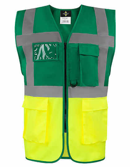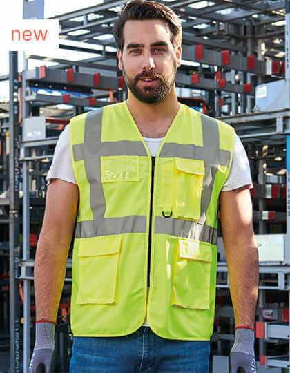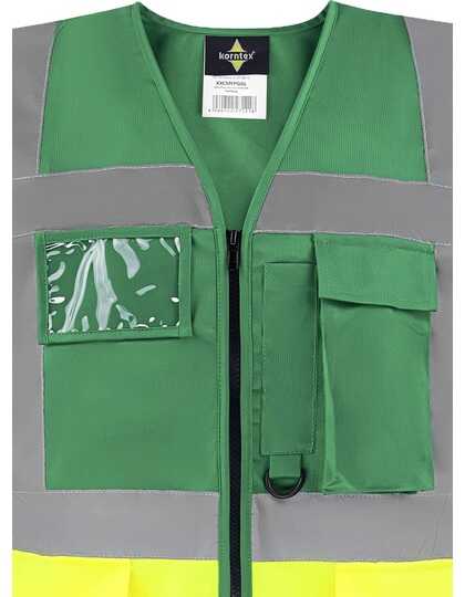 Žltá, oranžová, žltá/modrá, žltá/námornícka modrá a žltá/čierna spĺňa požiadavky EN ISO 20471: 2013 + A1: 2016, oranžová spĺňa tiež požiadavky GO/RT 3279, neónovo zelená a neónovo ružová sú certifikované podľa EN 1150, všetky ostatné farby nevyhovujú EN ISO 20471: 2013 + A1: 2016 a nie sú OOP | 5 cm široký reflexný pásik okolo tela | Dva 5 cm široké reflexné prúžky cez rameno | Zips vpredu po celej dĺžke | Dve vrecká s klopami na suchý zips | Multifunkčná: vrecko na preukaz, veľké vrecko na telefón, držiak na pero a krúžok na kľúče | Výrobca zaručuje reflexné vlastnosti v súlade s normou EN pre 25 praní pri 40 ° C. | Vybavená čiarovým kódom EAN | Návod na použitie v 24 úradných jazykoch EÚ | Jednotlivo balené v polyetylénových sáčkoch