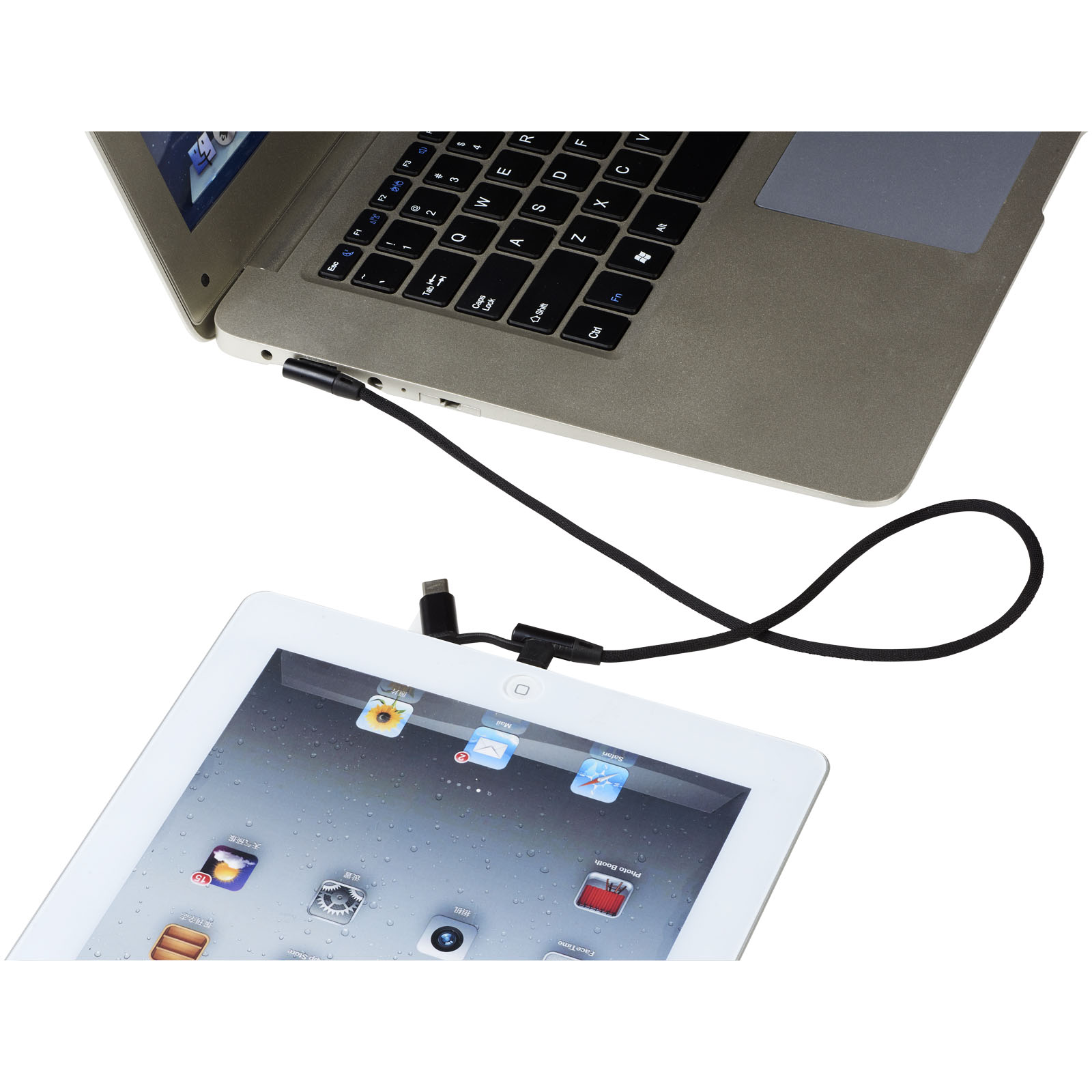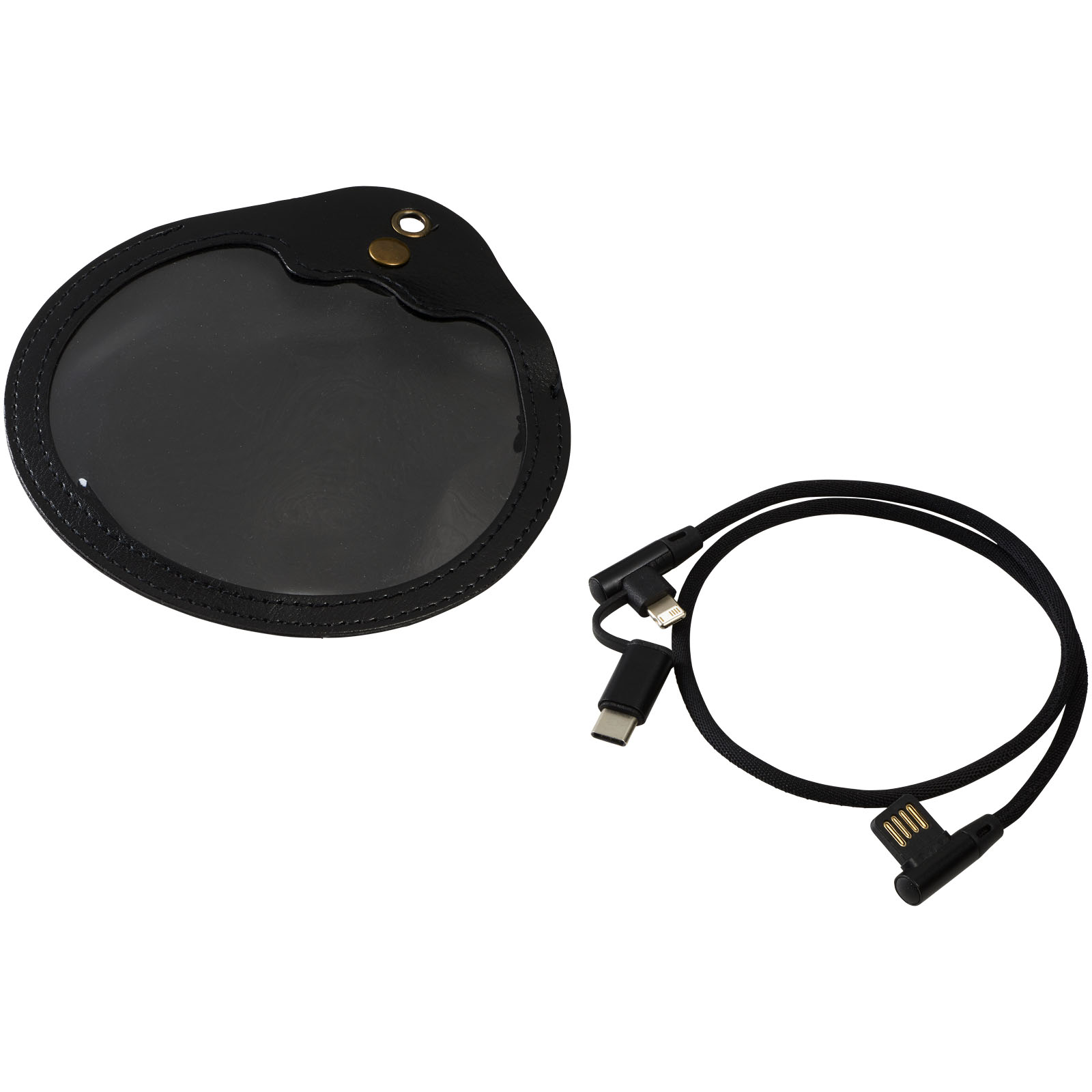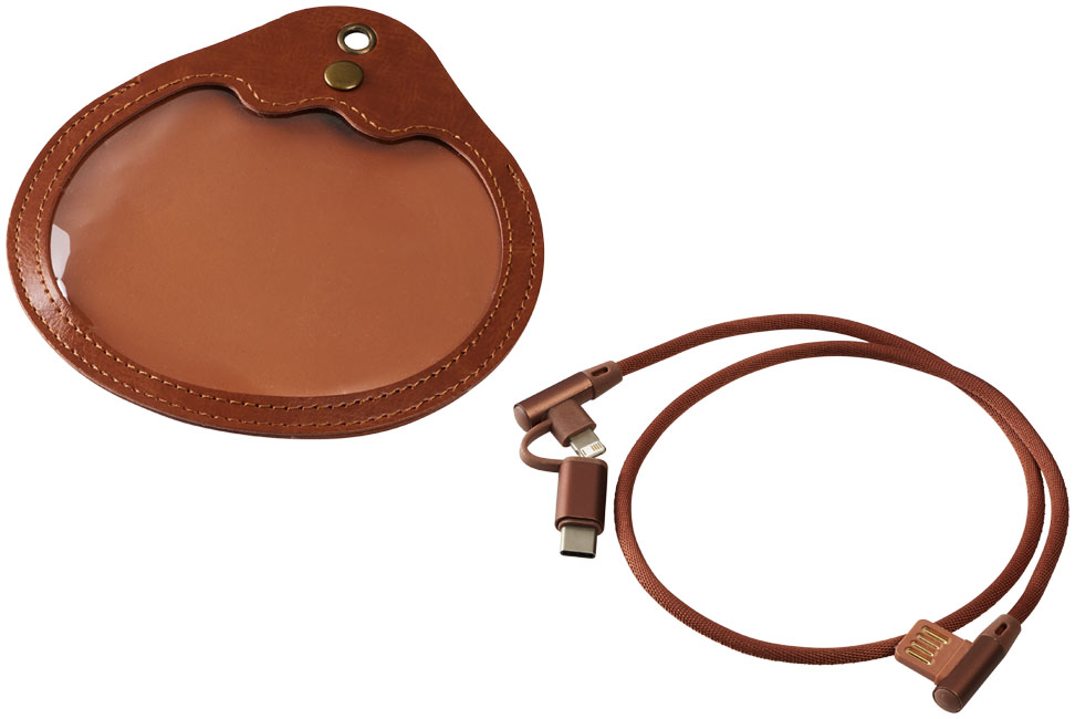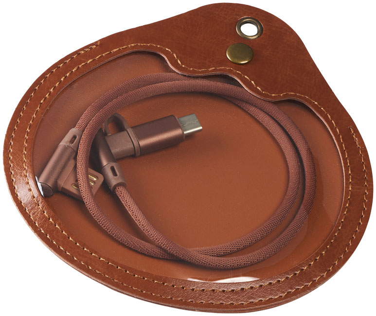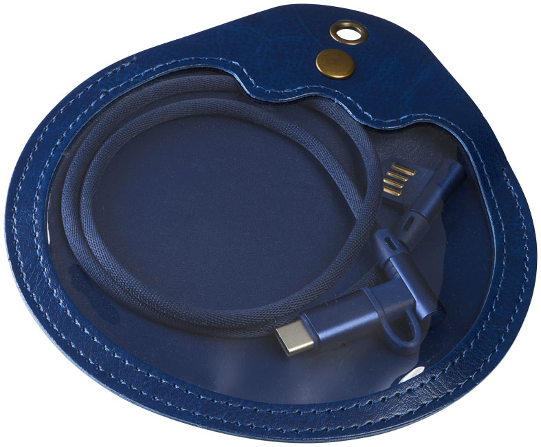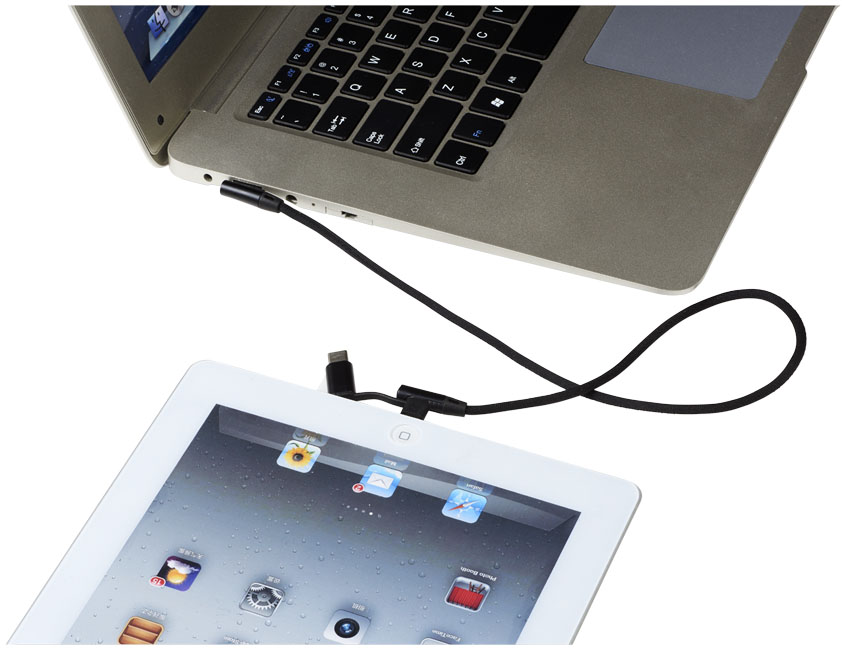Nabíjací kábel Ecliptica 3 v 1. Kábel Ecliptica 3 v 1 je uložený v mäkkom ochrannom puzdre. Jedná sa o dvojitý splietaný kábel z nylonu s 90stupňovým rozhraním koncovky USB typu C a duálna kompatibilná koncovkua2 v 1 pre zariadenia Apple iOS a Android. Podporuje nabíjanie a dátový prenos. Dĺžka kábla: 50 cm. Plast ABS, PU.