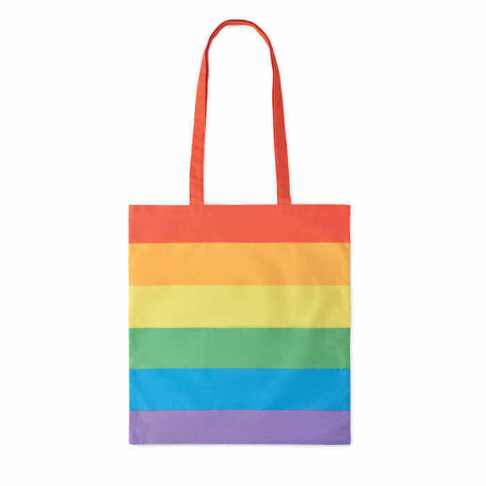 Nákupná taška z dúhovej bavlny 200 gr/m² s dlhými ušami. Pridajte trochu farby svojej značke alebo špeciálnemu oznámeniu pomocou tejto veselej tašky. Táto taška je ideálna na každodenné nákupy potravín. Môžete ju nosiť za dlhé uchá alebo si ju zavesiť cez rameno, aby ste mali voľné ruky. Hmotnostný limit na prenášanie je 2,5 kg.