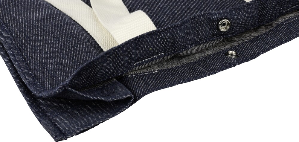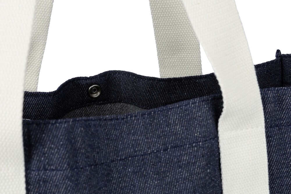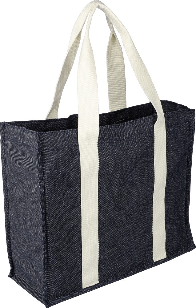 Nákupná taška z džínsoviny (280 g/m²) s 15-centimetrovými klinmi a dlhými plátennými rúčkami (280 g/m²). Džínsovina je vyrobená zo 65 % polyesteru a 35 % bavlny. Zapínanie tašky na tlačidlo. Stálofarebnosť džínsoviny je 2 – 3 úrovne. Rozmery: 33 x 39 x 15 cm.