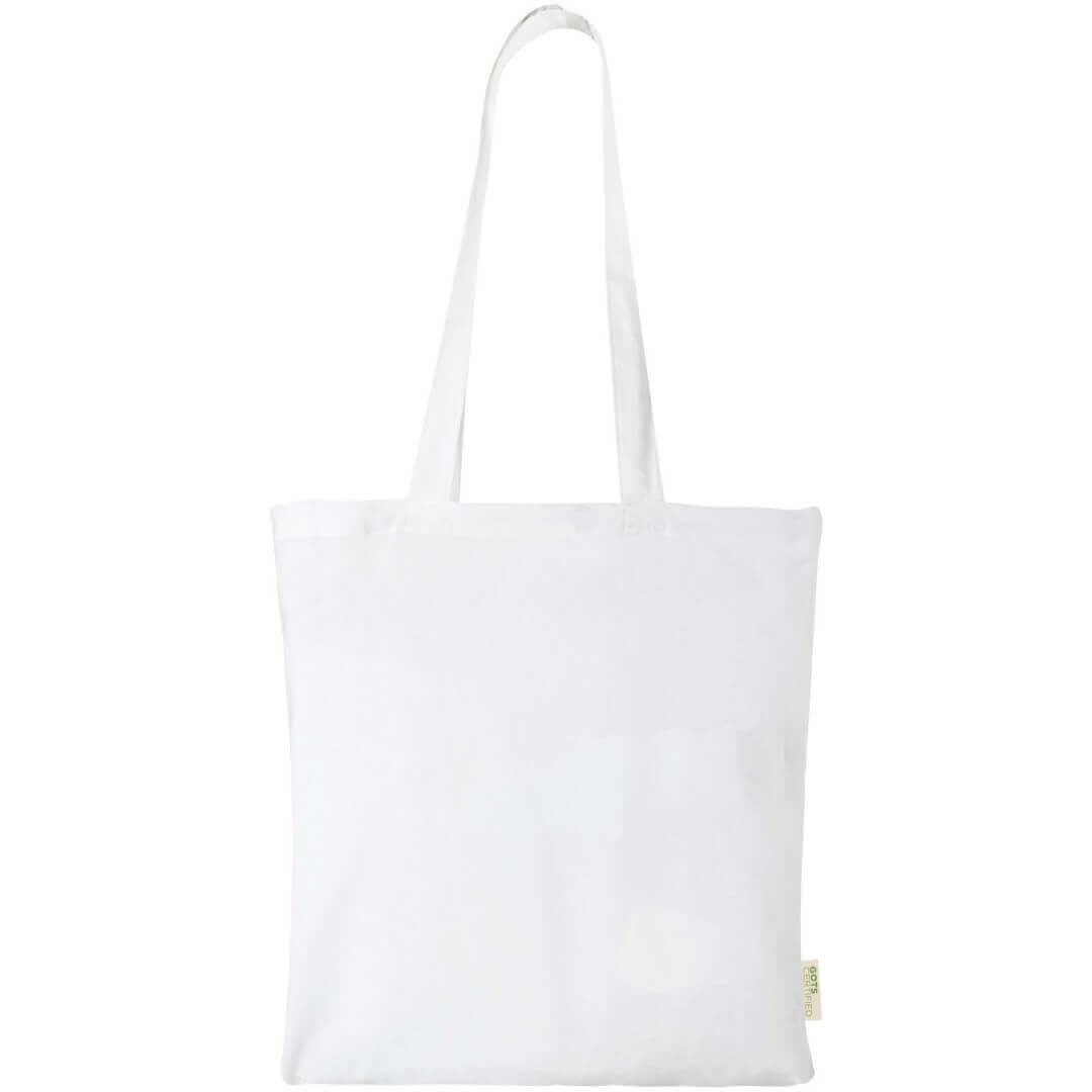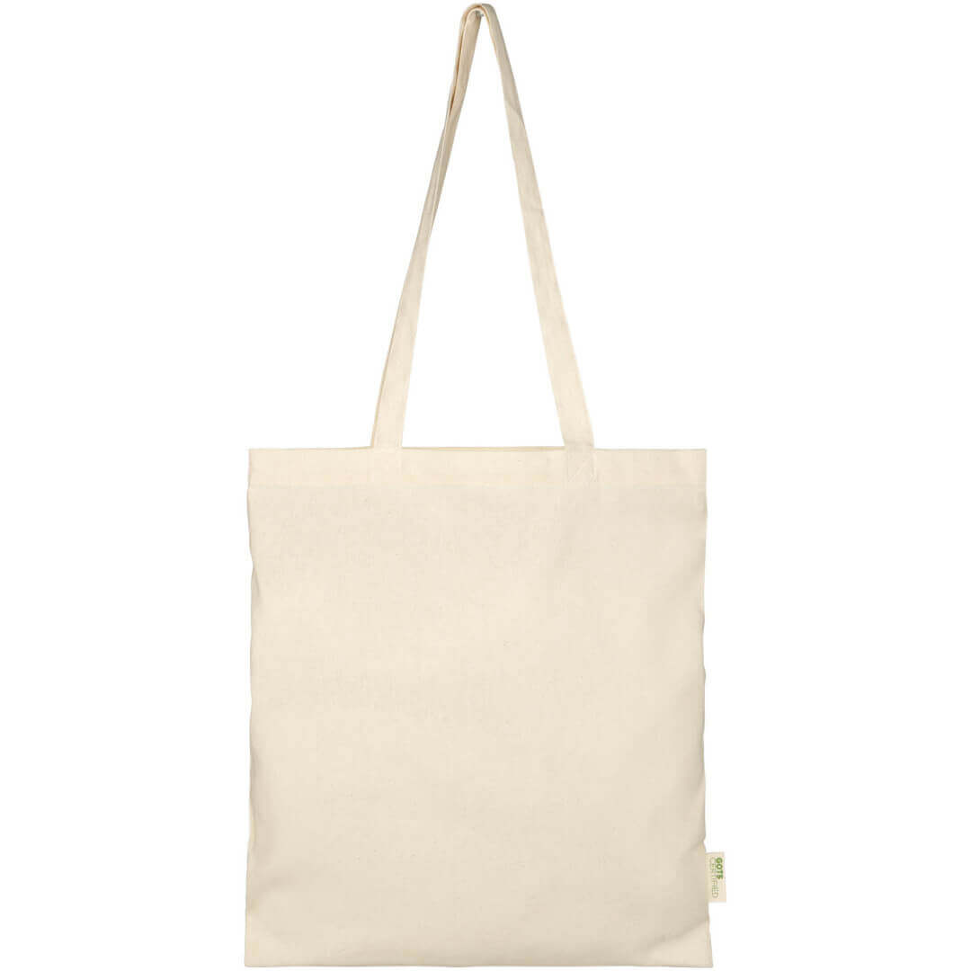 Dokonalá bavlnená nákupná taška s certifikátom GOTS, ktorú môžete rozdávať počas akejkoľvek akcie, konferencie alebo použiť ako nákupnú tašku pre malé nákupy. Vďaka hustote bavlny 140 g/m² je taška pevná, má dlhú životnosť a je vhodná na prepravu ťažkých predmetov. Má 32cm dlhé uši, takže sa ľahko nosia cez rameno.