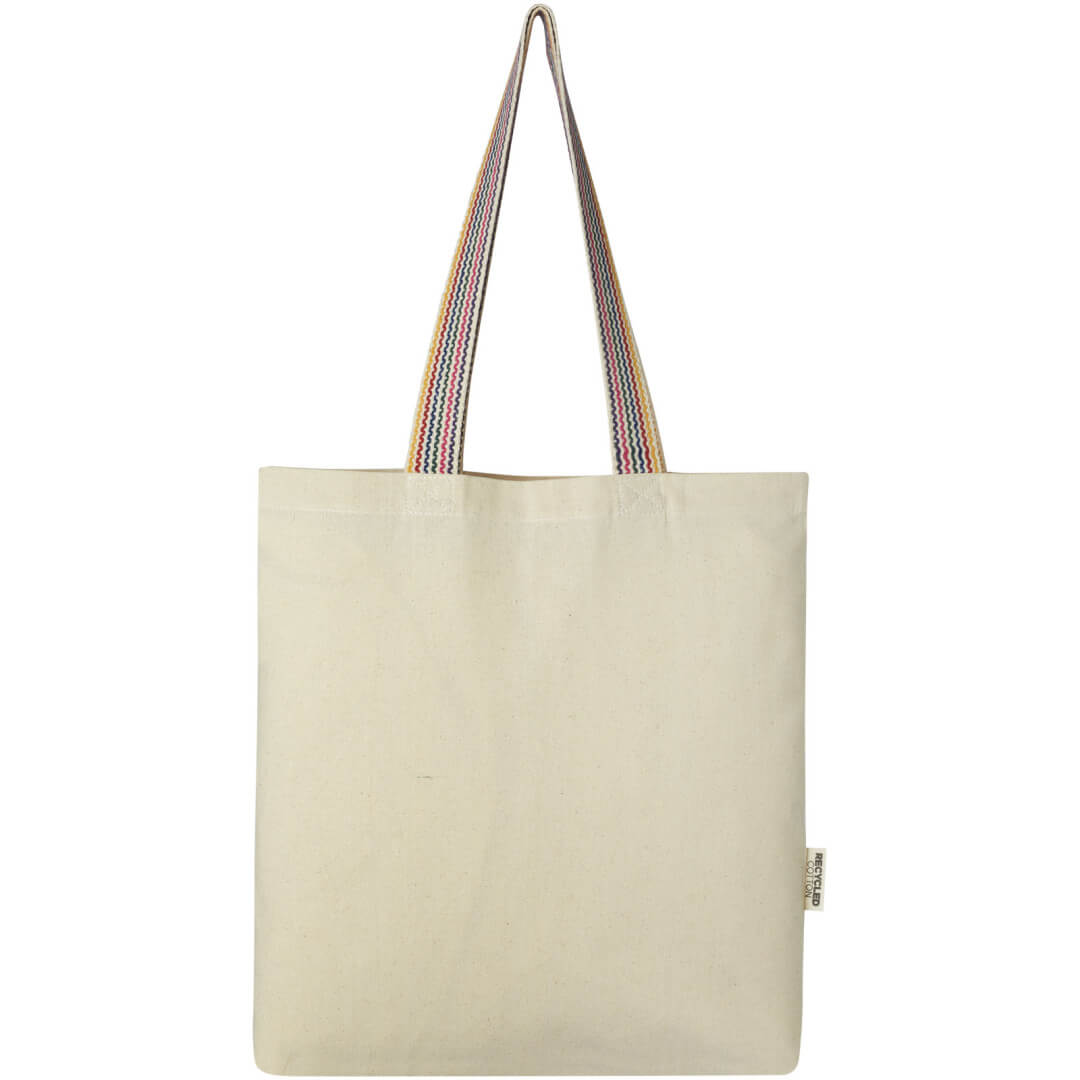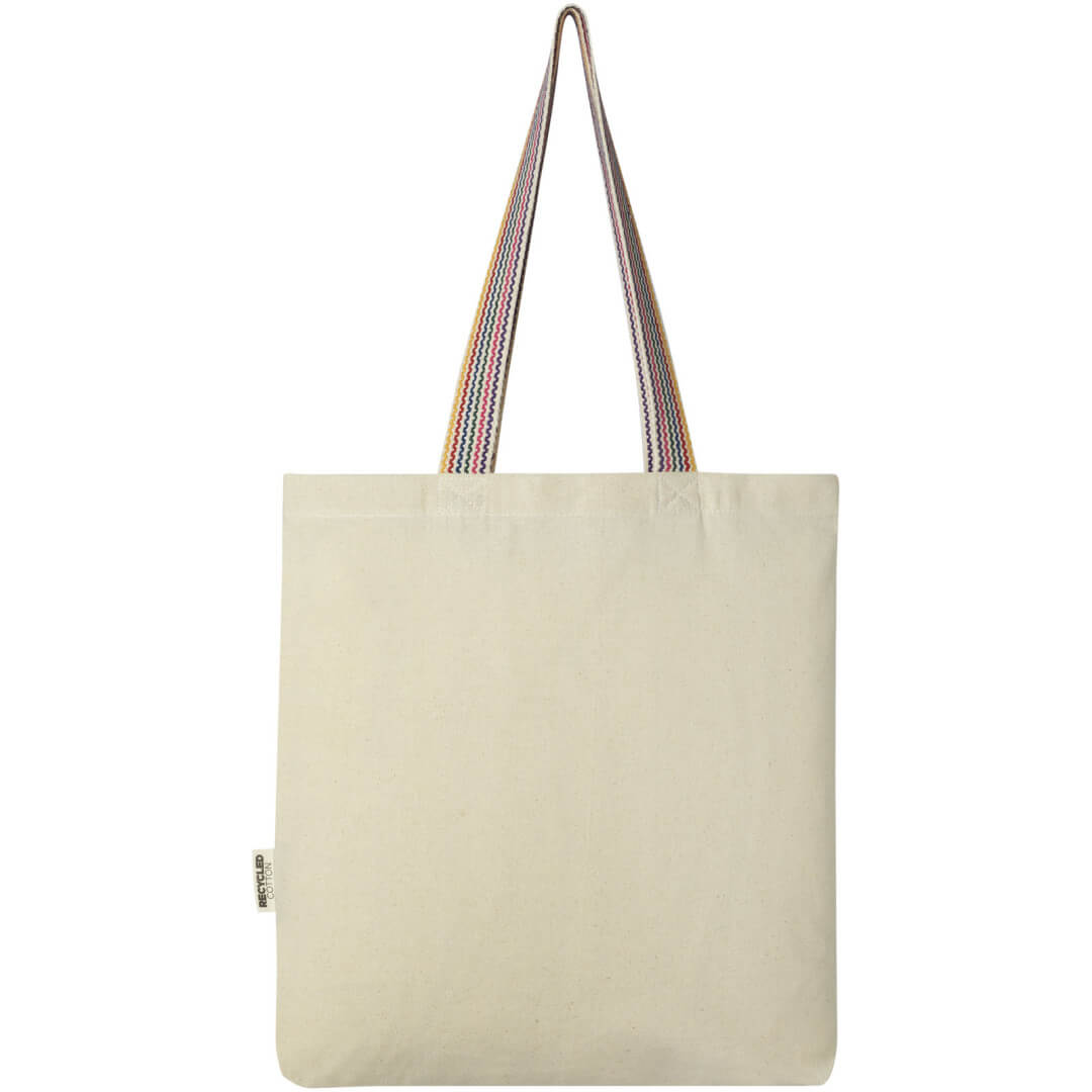 Nákupná taška Rainbow s gramážou 180 g/m² je vylepšením bežnej bavlnenej tašky. Táto taška na potraviny je vyrobená z recyklovanej bavlny a má 25 cm dlhé uši z dúhového popruhu a 3,5 cm dno pre väčší úložný priestor.