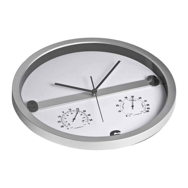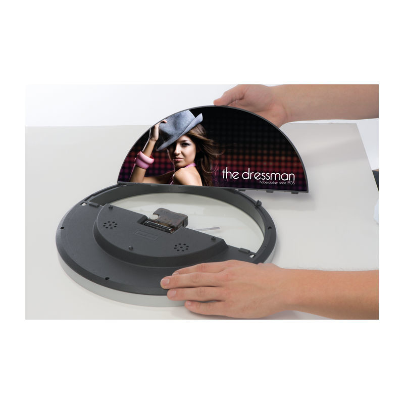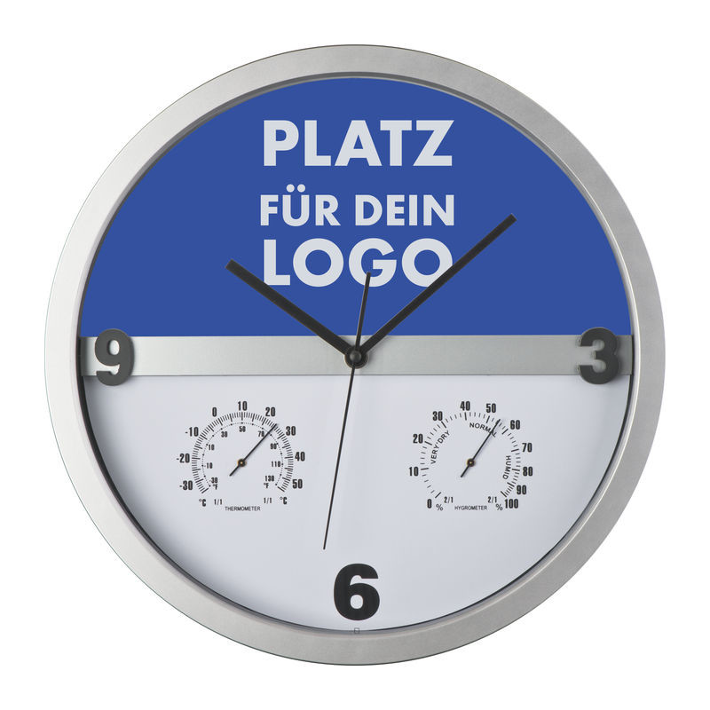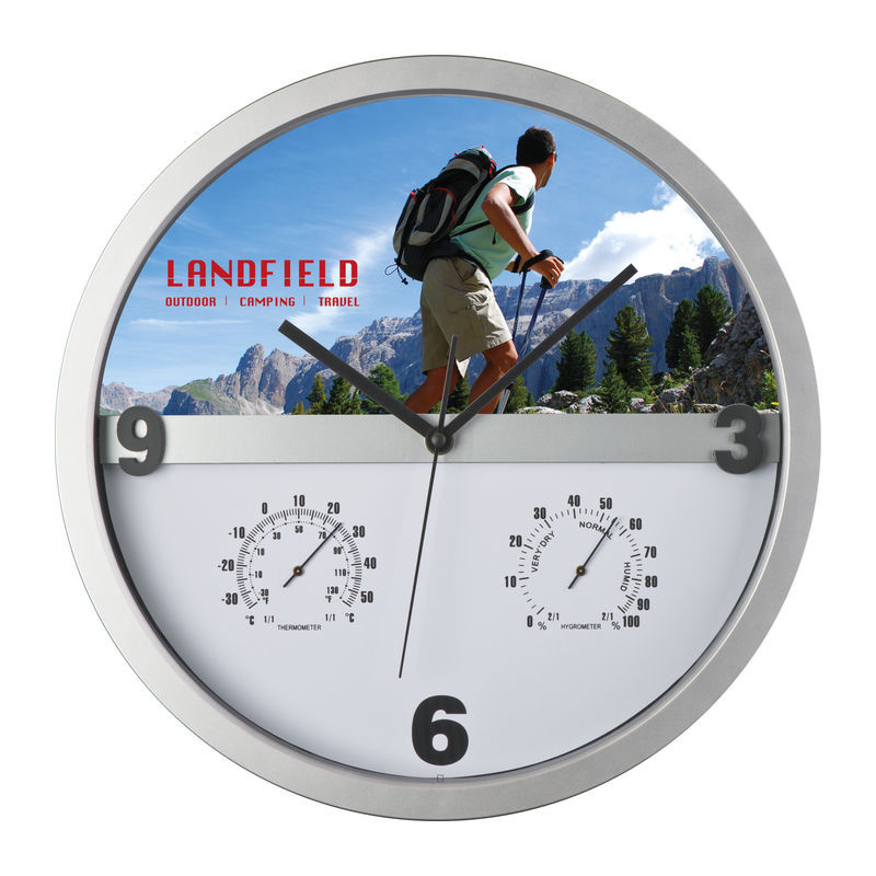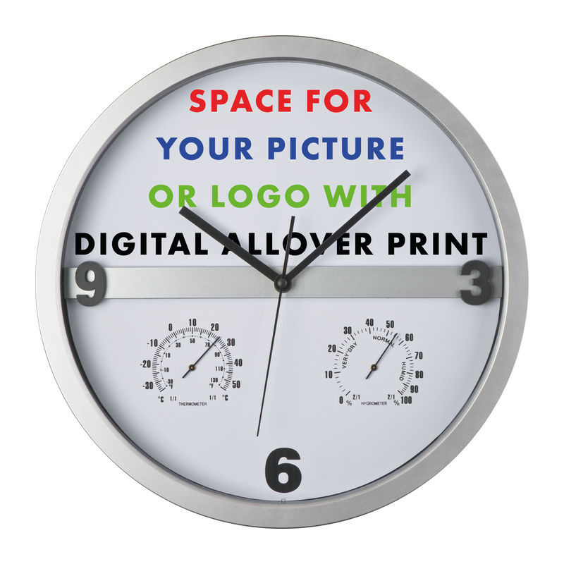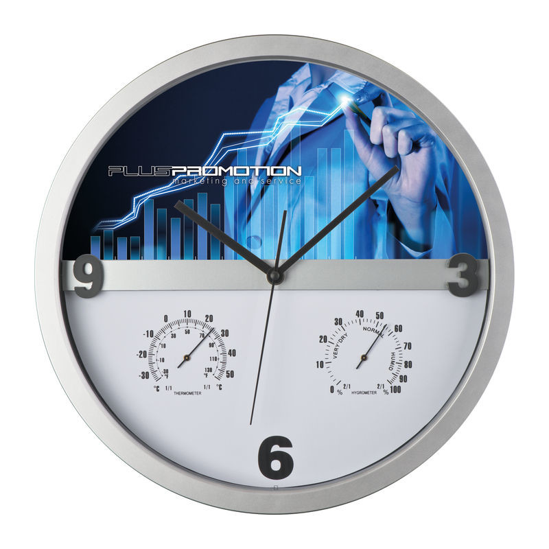 Štýlové nástenné hodiny s Hygro a teplomerom - podstata je v tom, že polovicu ciferníka sa dá ľahko vybrať z rámu a potlačiť ju celoplošne. Nekonečné možnosti pre tlač Vašej reklamy!