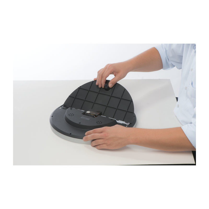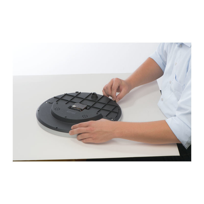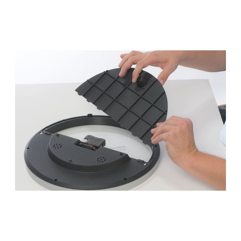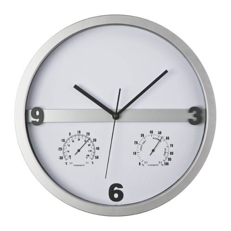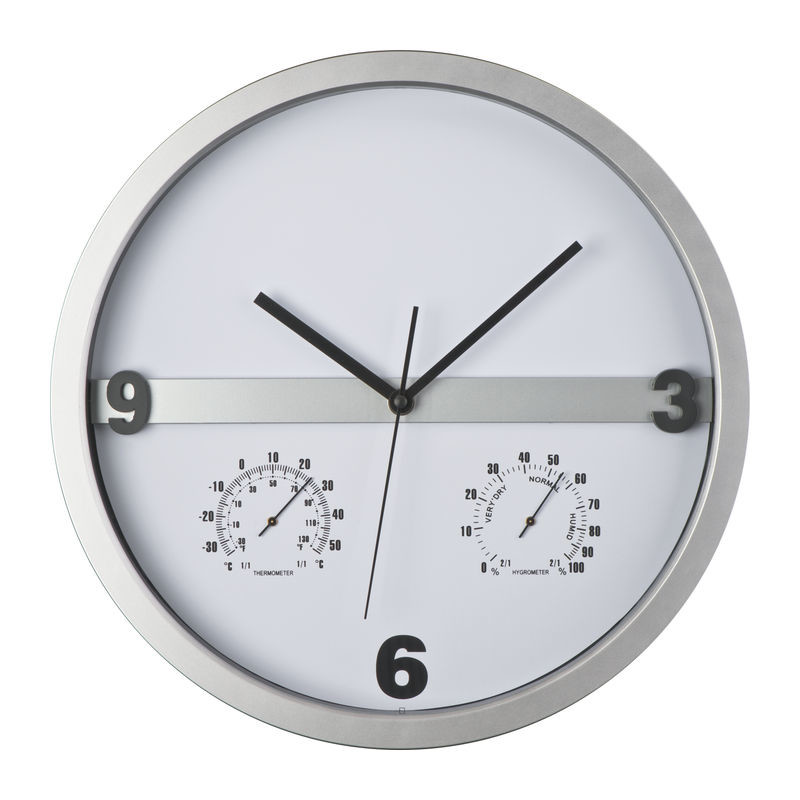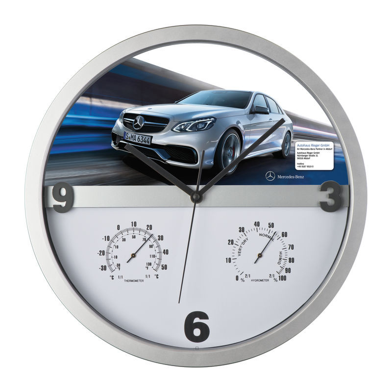 Štýlové nástenné hodiny s Hygro a teplomerom - podstata je v tom, že polovicu ciferníka sa dá ľahko vybrať z rámu a potlačiť ju celoplošne. Nekonečné možnosti pre tlač Vašej reklamy!