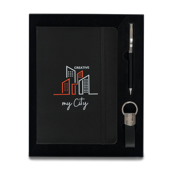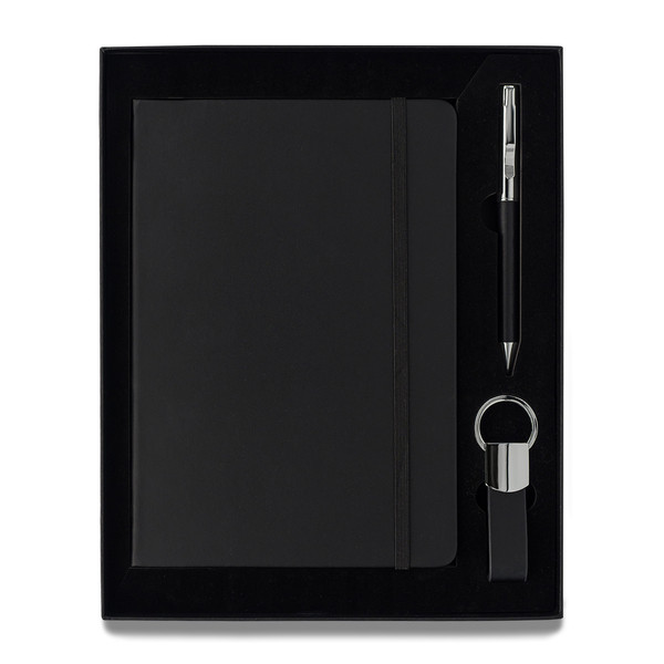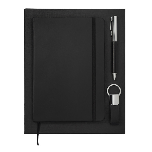 Darčeková sada so zápisníkom A5, guličkovým perom a príveskom na kľúče. Zápisník s tvrdými doskami, 80 linkovaných listov (70 g/m2). Guľôčkové pero s modrou náplňou. Všetky súčasti majú povrch z eko kože (PU). Sada je balená v čiernej darčekovej krabičke.