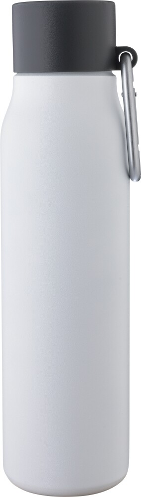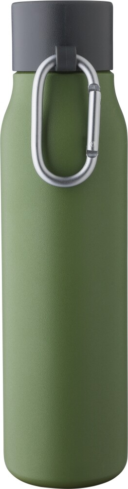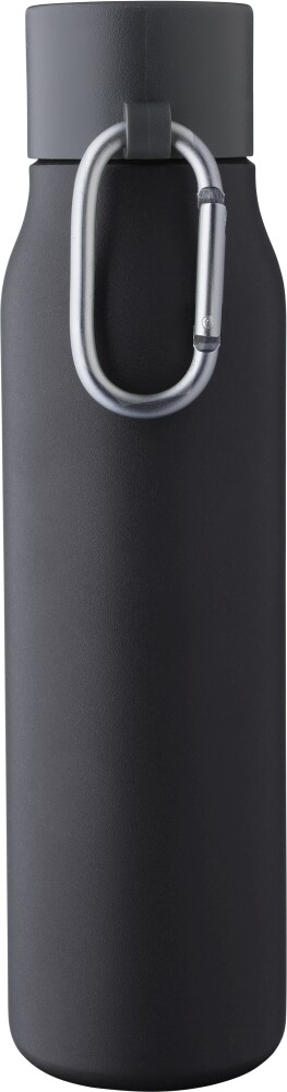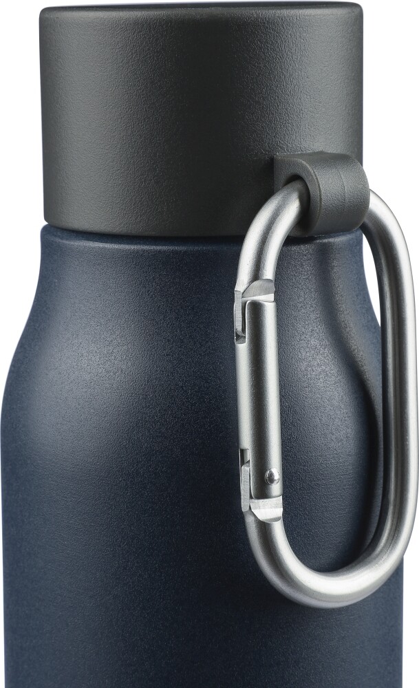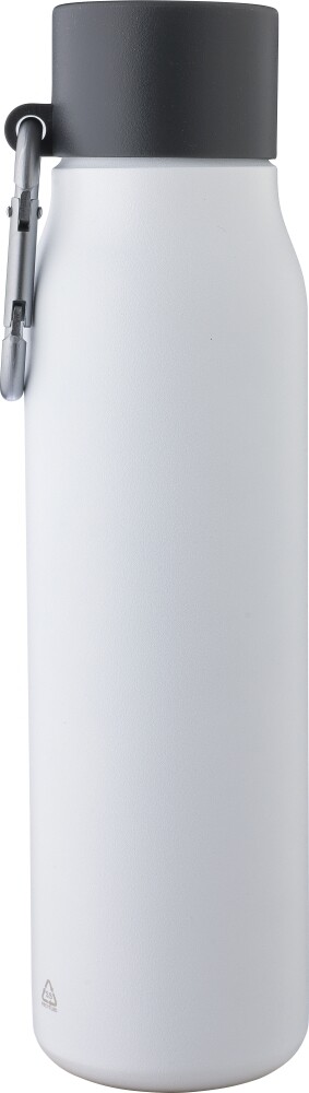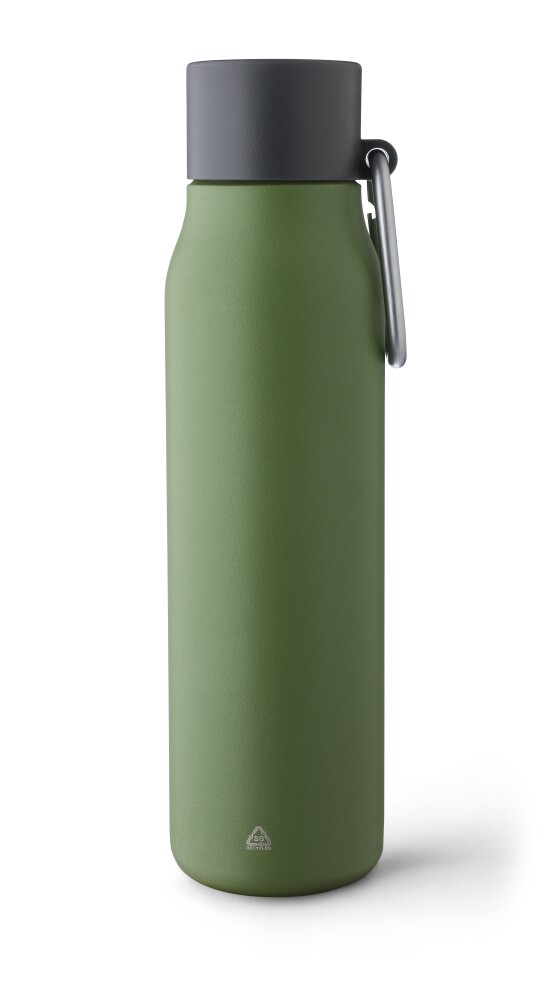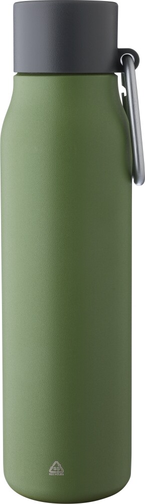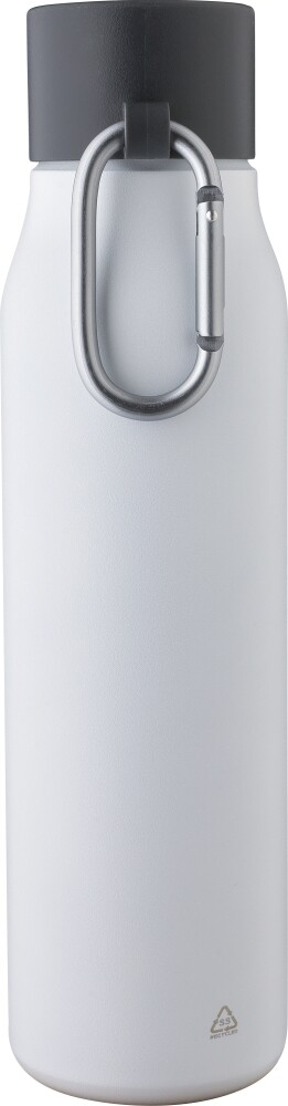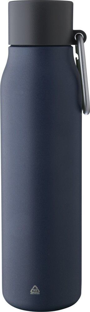 Termoska z recyklovanej nerezovej ocele s objemom 600ml. Má nepriepustné čierne PP veko s hliníkovou karabínou a pútkom na nosenie. Udrží nápoje teplé po dobu 6 hodín alebo studené po dobu 9 hodín. Vrátane gravírovaného recyklovaného loga na prednej strane. Jednotlivo balené v hnedej kartónovej krabici. Rozmery: 6,5 x 6,5 x 25 cm.