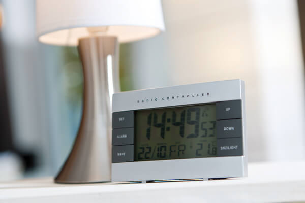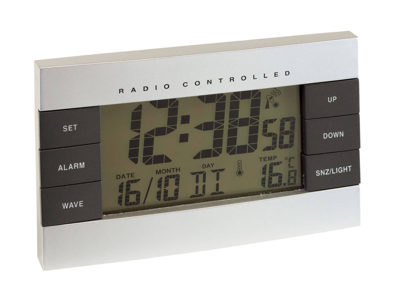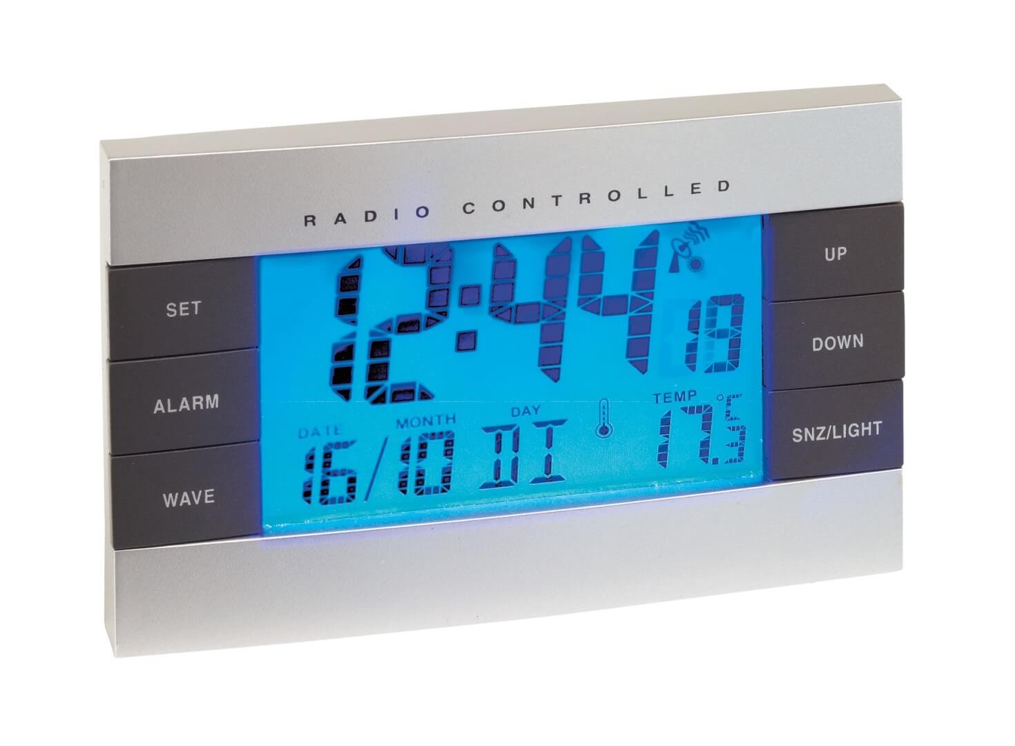 Rádiom riadené hodiny, LCD obrazovkou, budík, dátum a teplomerom, s modrým podsvietením