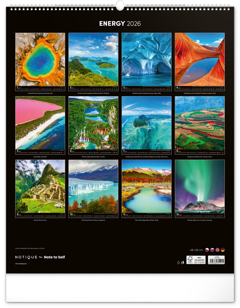 Kalendár z kolekcie Platinum Collection obsahuje veľkoformátové fotografie prírodných scenérií z exotických krajín. Zaveste si na stenu okno do sveta!Fotografie islandskej prírody alebo arménskeho kláštora dopĺňa univerzálne kalendárium na čiernom...