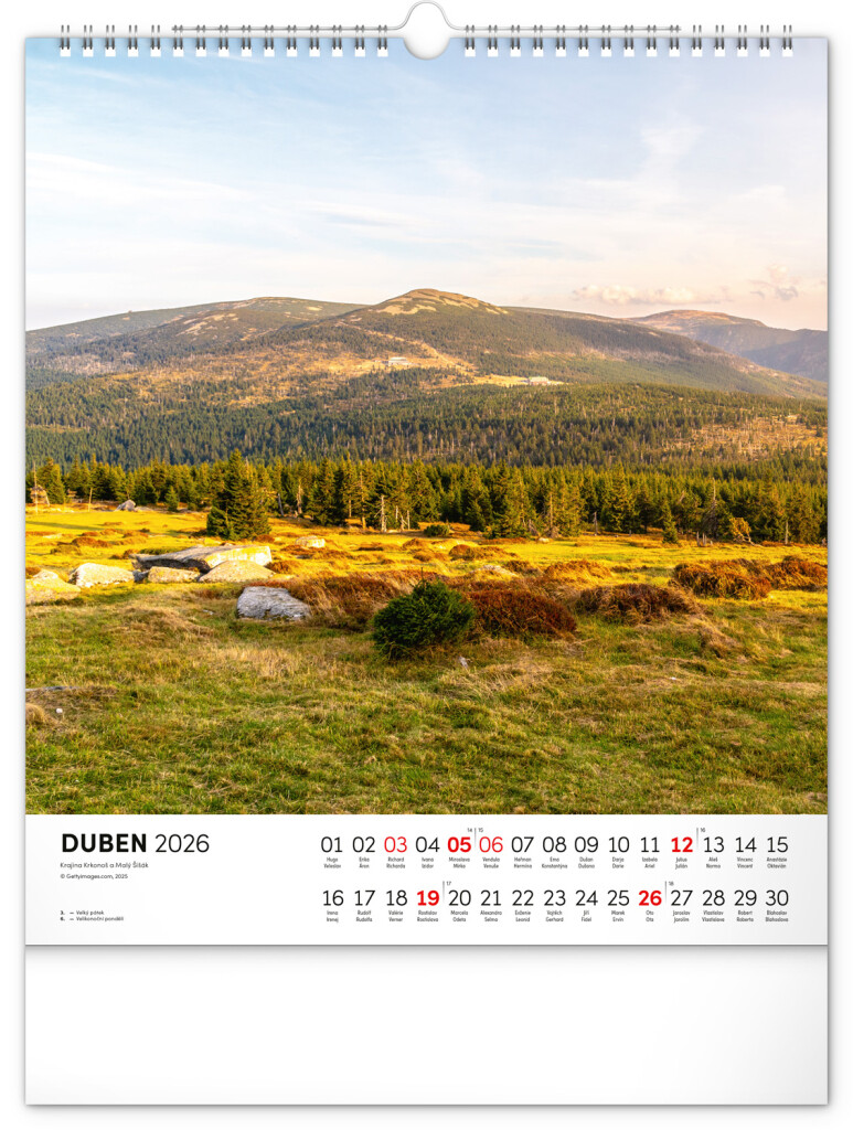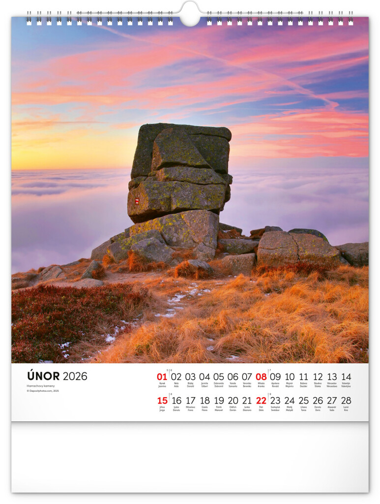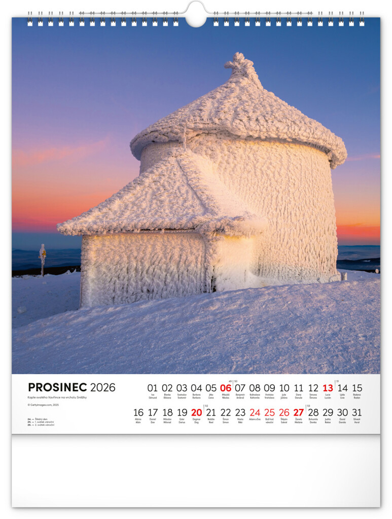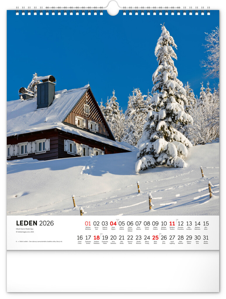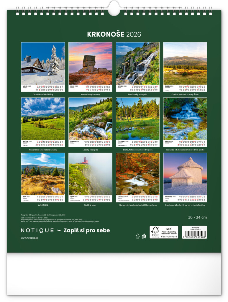 Dvanásť pôsobivých snímok zachytávajúcich krásu Krkonôš v štvorcovom formáte. Fotografie sú doplnené jednoduchým kalendáriom na bielom pozadí.