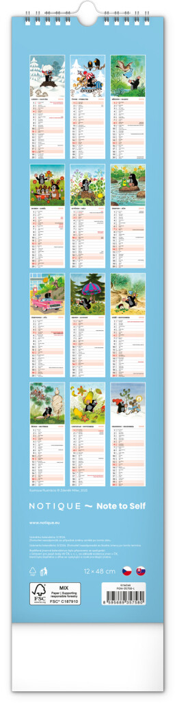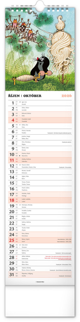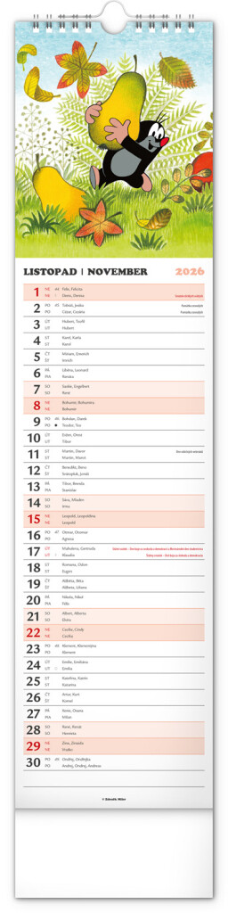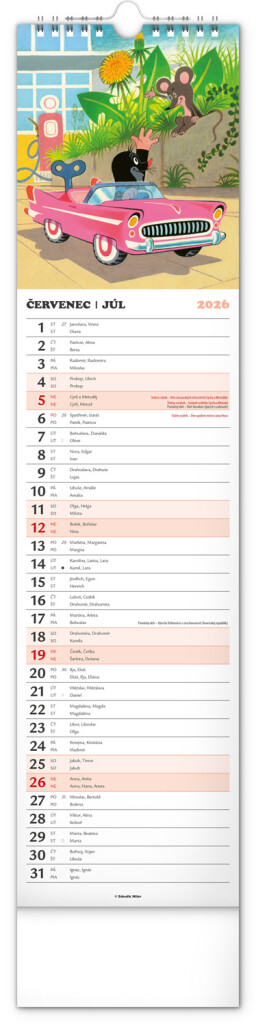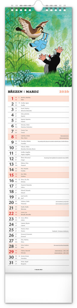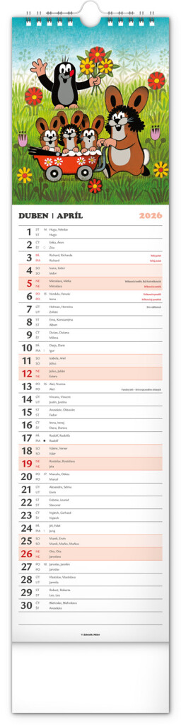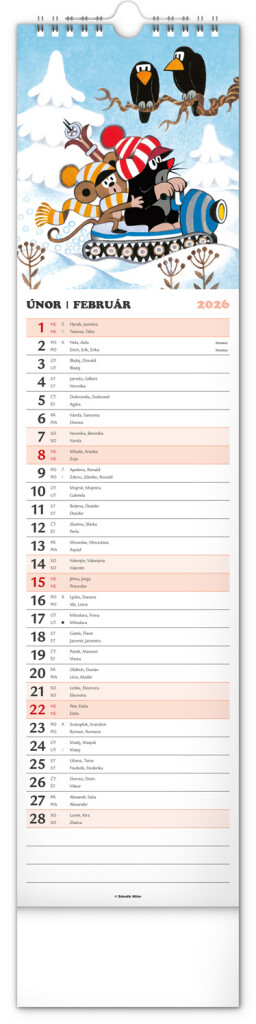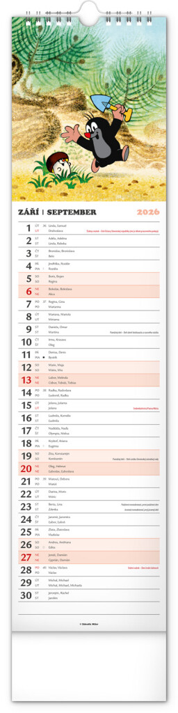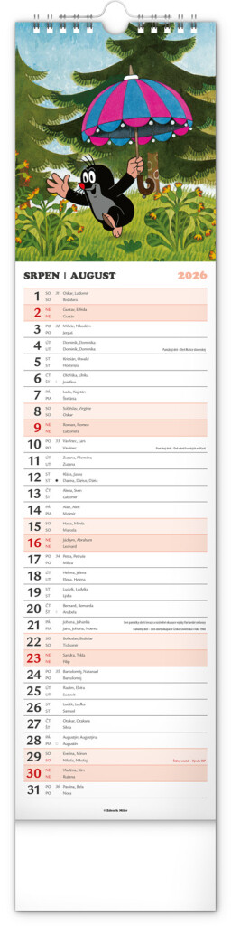 Praktický kravatový formát kalendára s ilustráciami Zdeňka Milera. Ilustrácie v kalendári dopĺňa české a slovenské kalendárium s menami, sviatkami, pamätnými dňami a fázami mesiaca. Každý deň má priestor na poznámky, víkendové dni sú farebne odlíšené od pracovných.