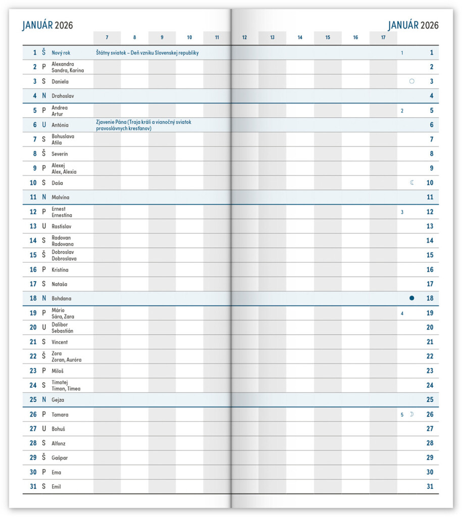 Praktický tenký diár vo vínovej farbe s mesačným rozložením sa zmestí skutočne všade. Obsahuje slovenské kalendárium s menami, sviatkami a pamätnými dňami, pracovný kalendár, zoznam mien a prehľad na rok 2026 a 2027.