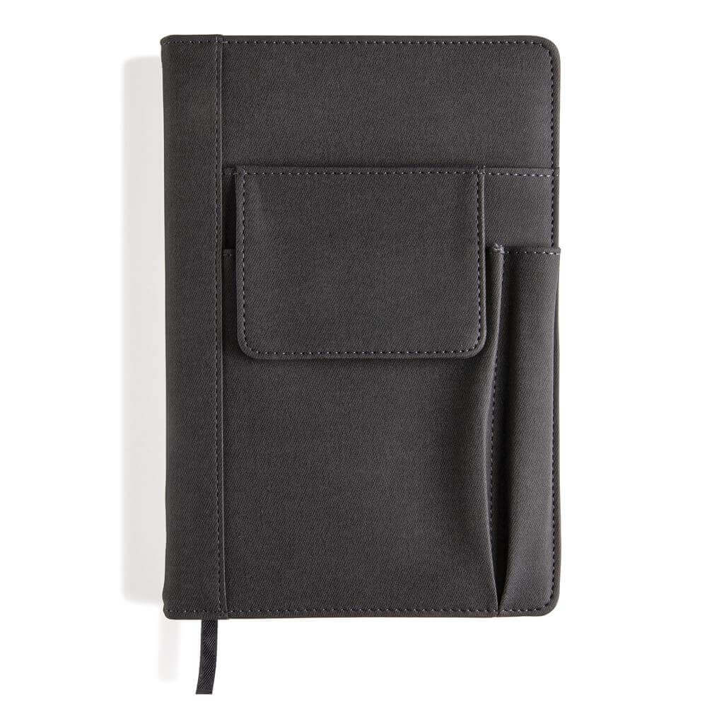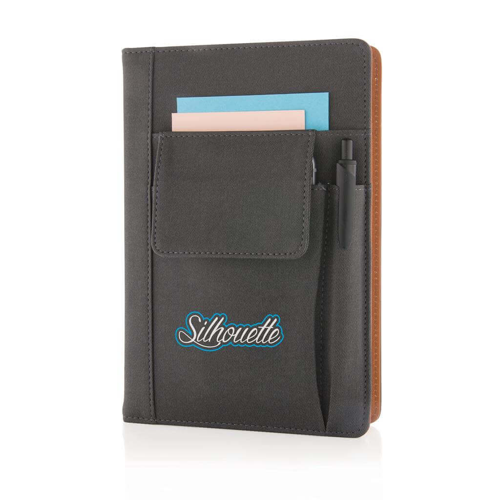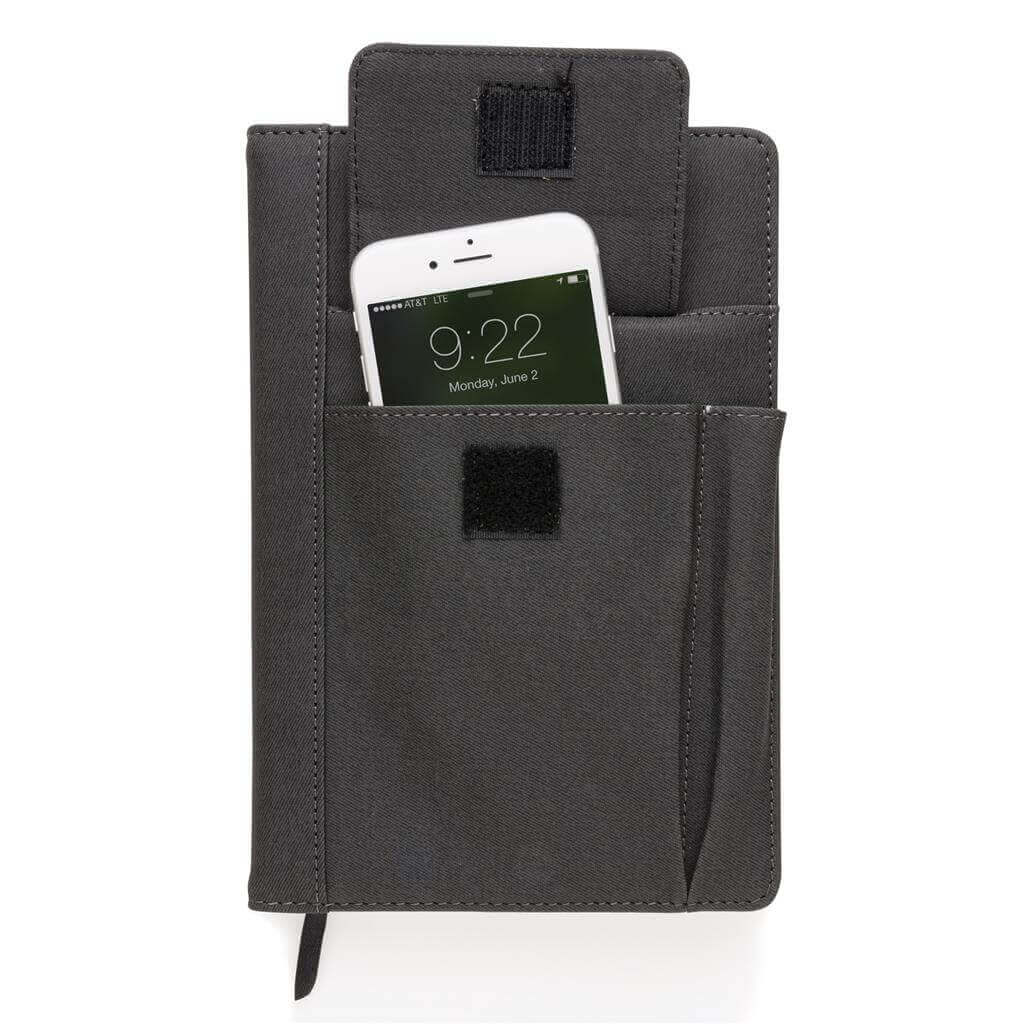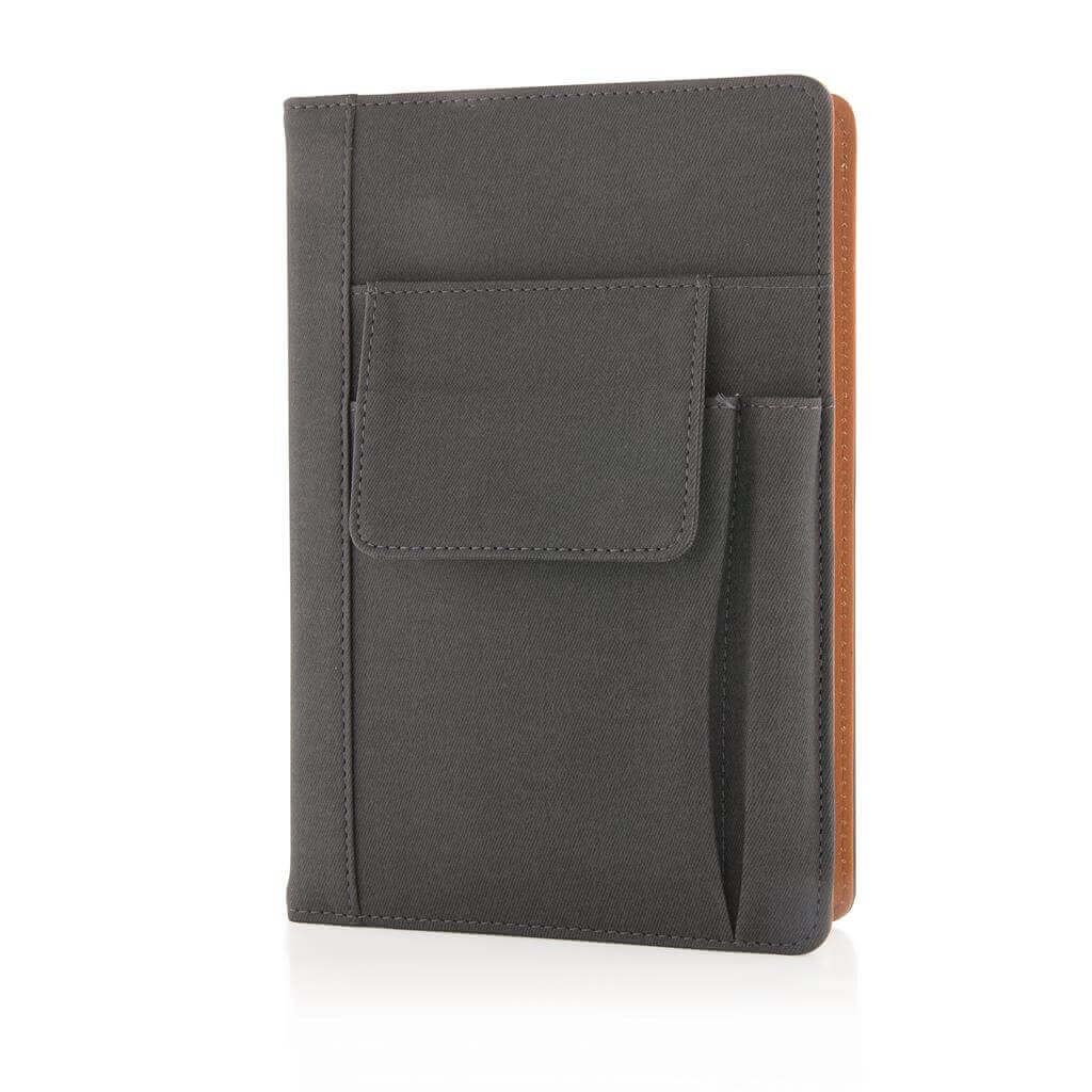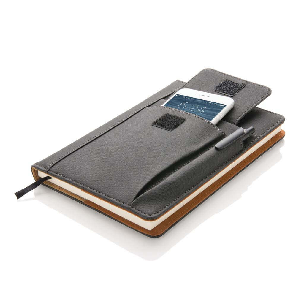Praktický PU obal na poznámkový blok s predným vreckom na telefón (14 x 10 cm), priehradkou na pero a dodatočným vreckom napríklad pre tenkú POWERBANK alebo vizitky. Vrátane vymeniteľného zápisníku s čiernou záložkou a 160 linkovaným stranami o gramáži 80 g / m2.