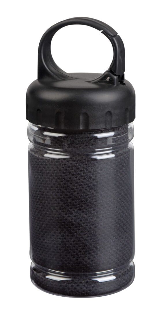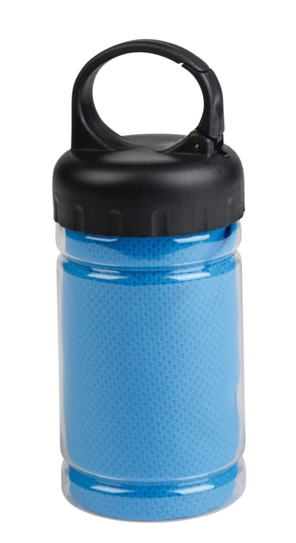 Ochladzujúci uterák CHILLING: v priehľadnej nádobe, s integrovaným ochranným faktorom proti slnečnému žiareniu, pre dlhotrvajúci chladivý efekt navlhčite uterák vodou a vložte dovnútra alebo pridajte vodu do nádoby a dôkladne ju pretrepte, viečko s karabínkou v zodpovedajúcej farbe - ideálne pre fitness a športové aktivity