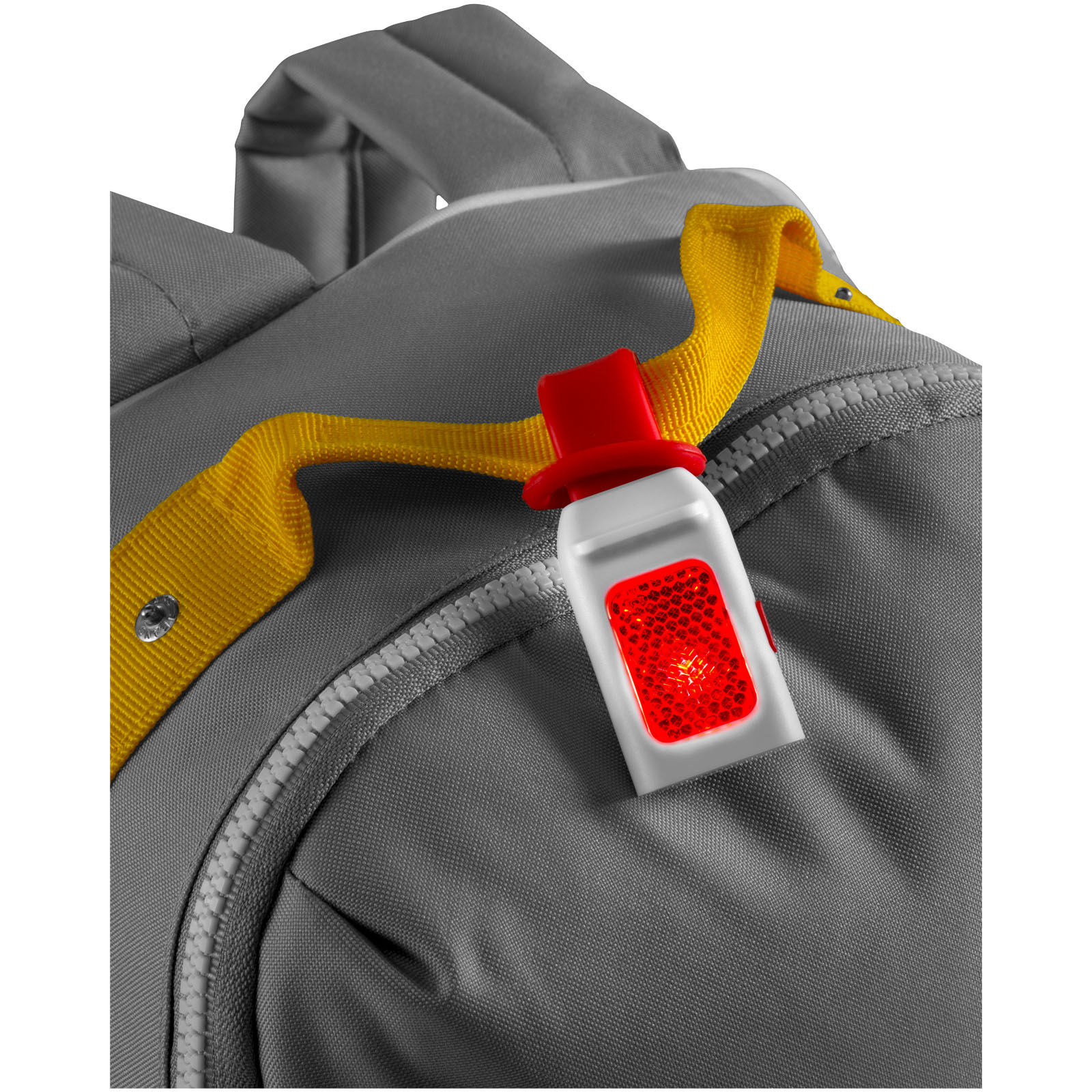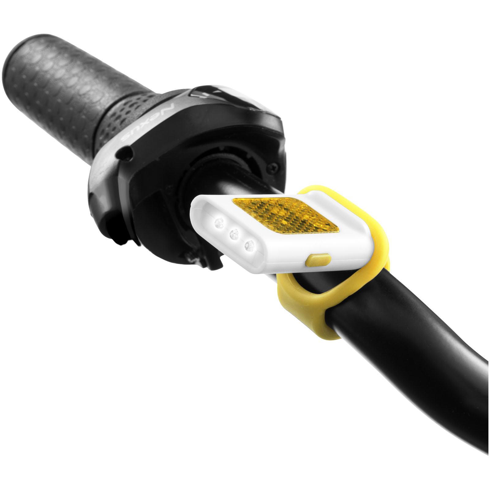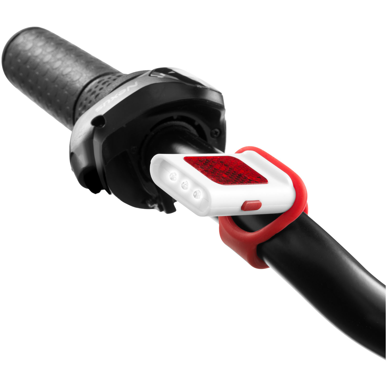 Odrazka a svietidlo Seemii. Vonkajšie odrazové LED svetlo s 3 jasnými bielymi LED svetlami a s funkciou stáleho či blikajúceho LED svetlá. Pružný silikónový pásik pre jednoduché pripevnenie k bicyklu alebo taške. Vrátane batérie. PS plast.