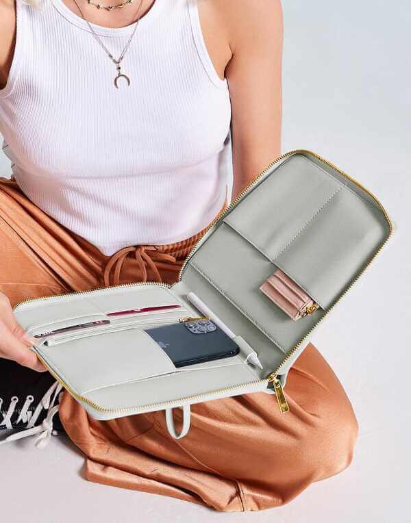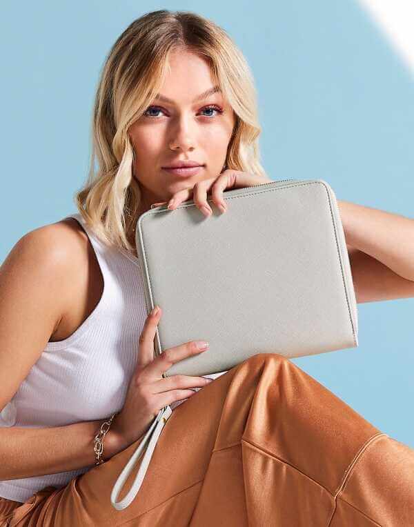 ·100% Polyurethane (Leather-look) ·jemný materiál Saffiano ·mäkká podšívka ·hlavná priehradka na zips ·viacero vnútorných vreciek ·priestor na 6 kreditných kariet ·kompatibilné s iPad mini / tabletom ·odtrhnuteľný štítok ·rozmery: 20 x 23 cm ·max. plocha tlače: 17 x 20 cm