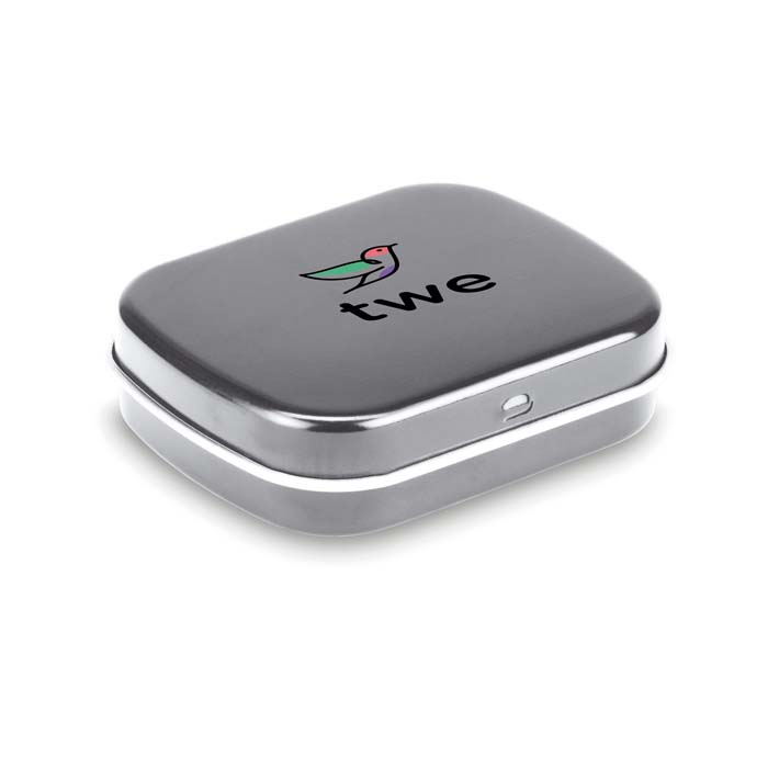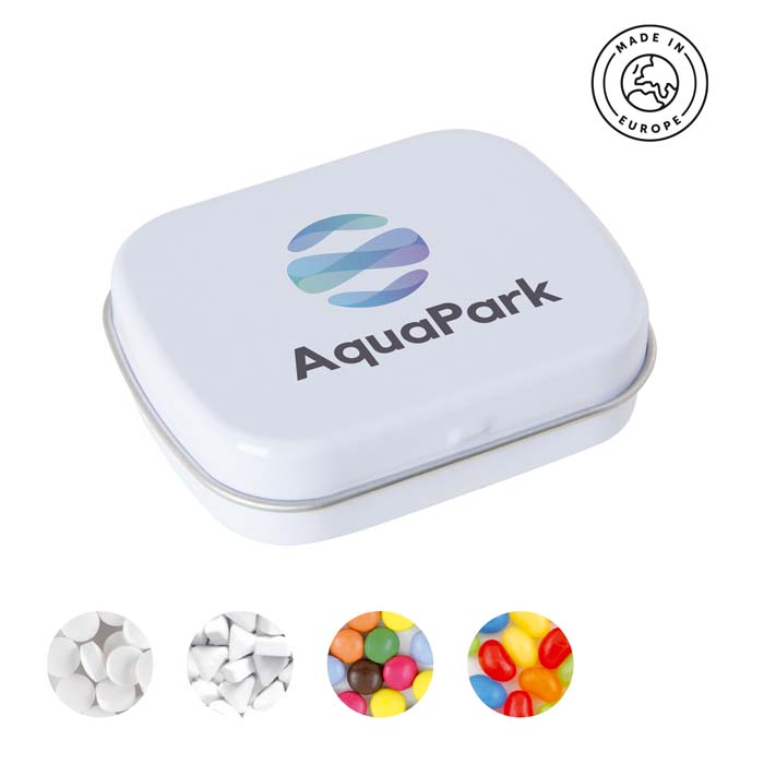 Vyrobené v Európe: Otváracia plechová krabička s cukríkmi. Veľkosť: 62x50x17 mm. Vyberte si z 12 rôznych farieb a zo 4 možností cukríkov.