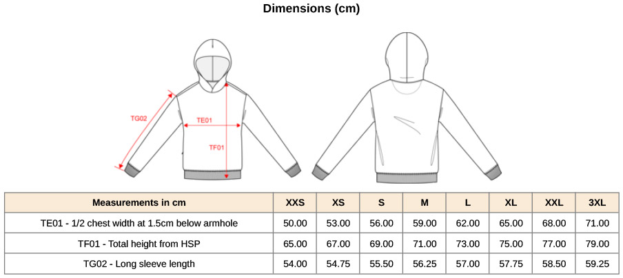 Veľkorysý strih, keprová krčná lemovka, polmesiacová podsádka na krku, nízko položené ramená, manžety a pás s elastanom, skryté vrecko na zips v pravom bočnom šve, dvojité švy na rukávoch a leme, zdrsnená vnútorná strana, štítok TearAway, neutrálna veľkosť na 40°