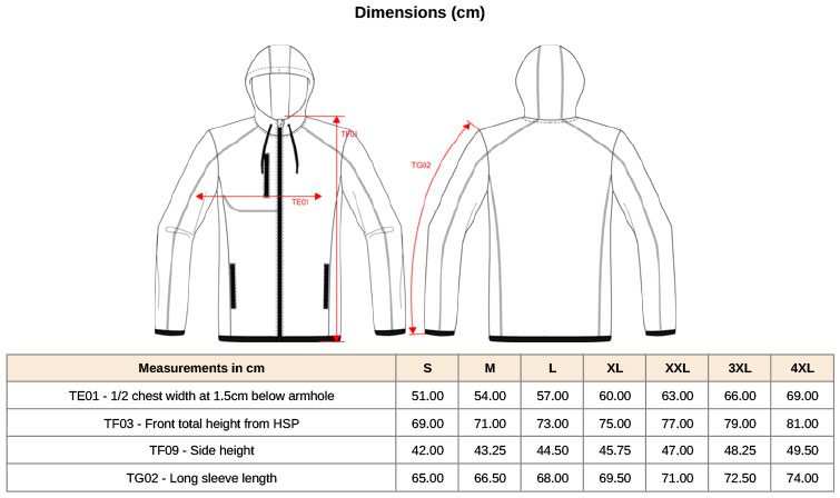 Vnútorná strana kapucňa a šnúrka v kontrastnej farbe, manžety a spodný lem z kontrastnej pásky, náprsné vrecko, 2 bočné vrecká so zipsom, krycí šev na vsadkách, zipsy v kontrastnej farbe, zdrsnená vnútorná strana, prateľné na 40 °, nemožno sušiť nemožno chemicky čistiť.