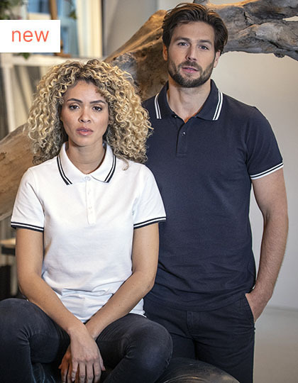 Pletenina piké | Plochý úpletový golier a ploché rebrované úpletové manžety na rukávoch | Kontrastné pruhy na golieri a rukávoch | Gombíková léga s dvoma gombíkmi | Útkové prešitie | Saténová spevňovacia páska za krkom | Bočné prieduchy obrúbené saténovou stuhou | Polmesiac | Predný ramenný šev s retiazkovým prešívaním | Farebne zladené ryté gombíky | Hlavný štítok vyrobený pomocou tepelného prenosu. 100% bavlna (sivé: 90% bavlna / 10% viskóza).
