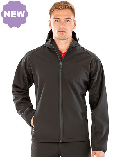 Vonkajšia vrstva: 100 % recyklovaný polyester, stredná vrstva: nepremokavá s vodným stĺpcom 8 000 mm, priedušnosť 3 000 mvp a vetruodolná membrána zo 100 % recyklovaného TPU, vnútorná vrstva: 100 % mikroflís z recyklovaného polyesteru. 290 g/m². Trojvrstvová mechanická priadza. Odolný softshell s kapucňou z pevnej recyklovanej tkaniny. Ekologické zipsy YKK NATULON® vpredu a na vreckách. Golier na zips s ochranou brady a jazdcom. Podšívka z mikroflísu pre mimoriadnu hrejivosť. Elastická lemovaná manžeta a lem. Dekoratívne horné prešitie. Nastaviteľná kapucňa. Vrecká na zips. Vnútorné vrecká. Závesné pútko. Recyklovaný materiál s použitím ekologických materiálov z recyklovaných plastových fliaš a priemyselného odpadu, ktorý je udržateľnou alternatívou bežných priadzí. Vyrobené z 23 (1litrových) plastových fliaš. Na konci životnosti recyklovateľné.