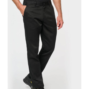 Materiál: 190g/m2, 65% polyester, 35% bavlna. Elastický pás s pútkami na opasok, zips a gombík, 2 šikmé bočné vrecká vrátane 1 vrecka na lístok, 2 zadné vrecká s lemovaním a zosilnenými švami, pútko na zavesenie, odolný materiál, prateľné na 60 °, možno sušiť v sušičke pri nízkej teplote, nemožno chemicky čistiť.