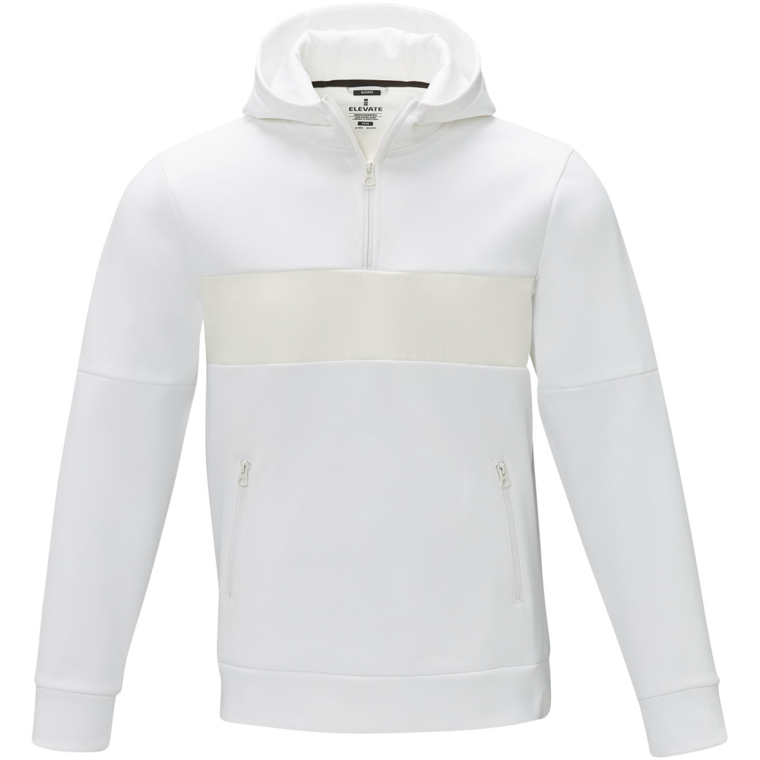 Štvrtinový zips. Model anorak. Predné vrecká so zipsom. Značkové závesné pútko. Ťaháčiky na zips s príjemným povrchom. Potlač štítku technológiou heat transfer pre väčšie pohodlie. Úplet 85% Polyester, 15% Sorona®, 350 g/m2, Contrast fabric, 280T ripstop 100% Nylon, 72 g/m2.