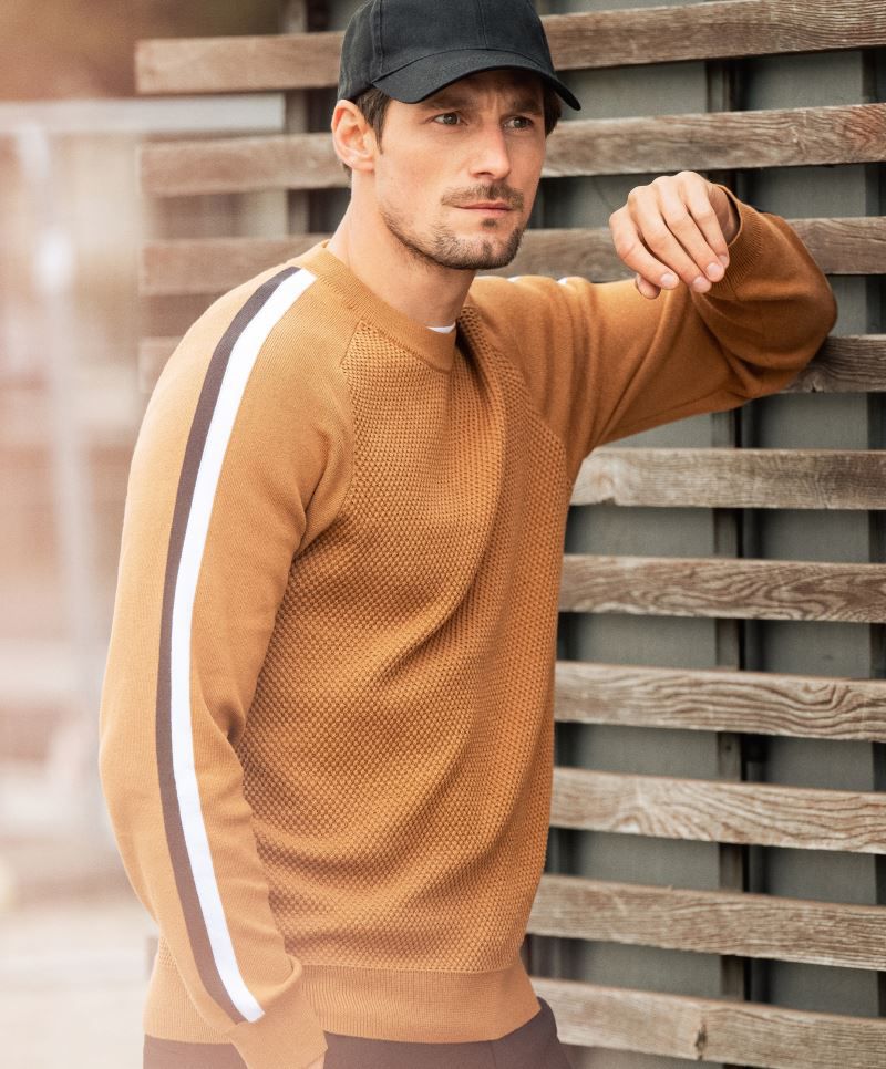 Predná a zadná strana zo špeciálneho úpletu s textúrou, široký rebrovaný okrúhly výstrih, raglánový rukáv, pruh v kontrastnej farbe na golieri a rukávoch.