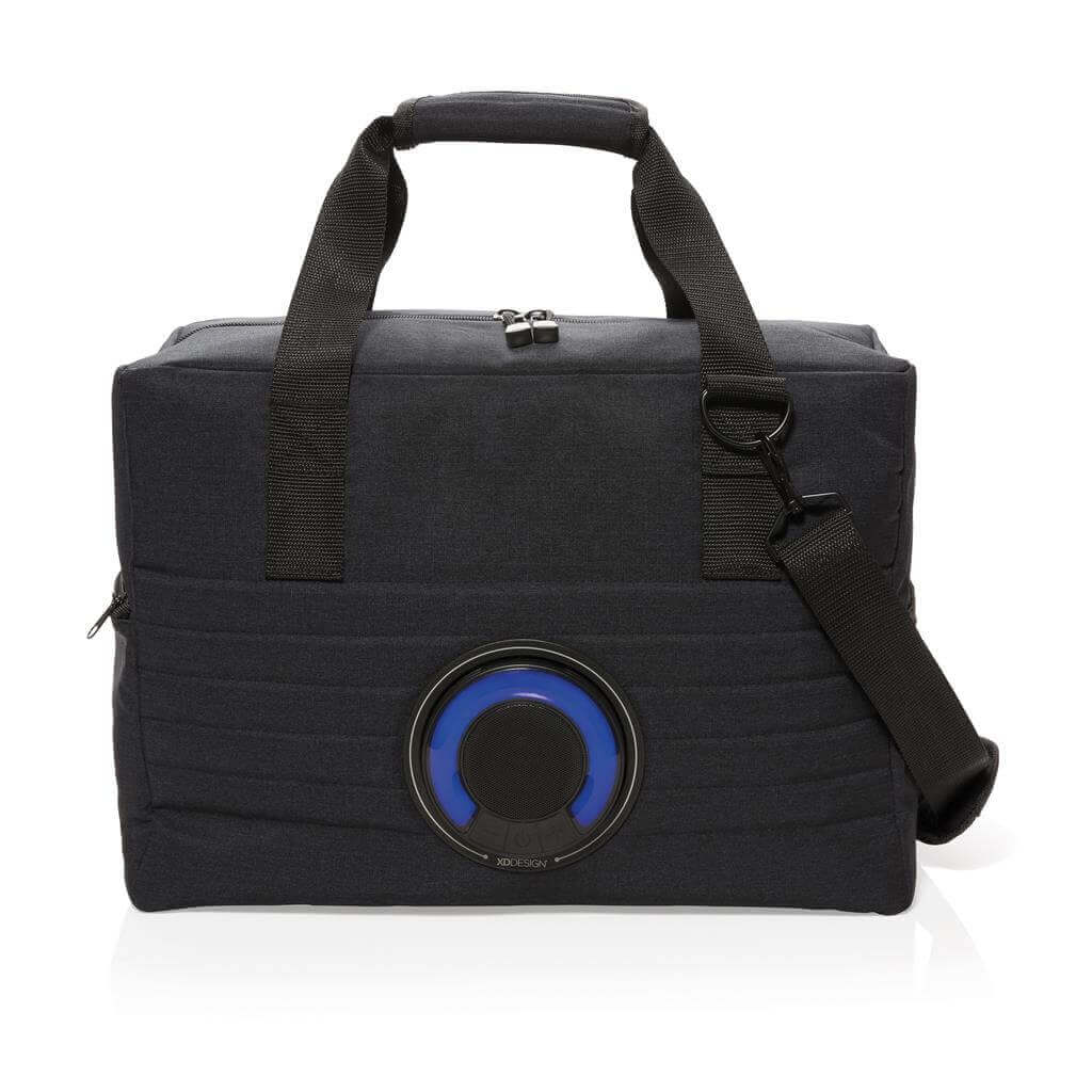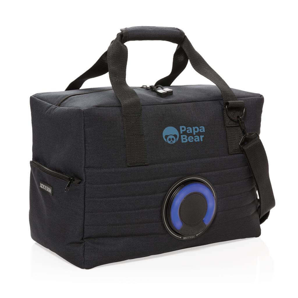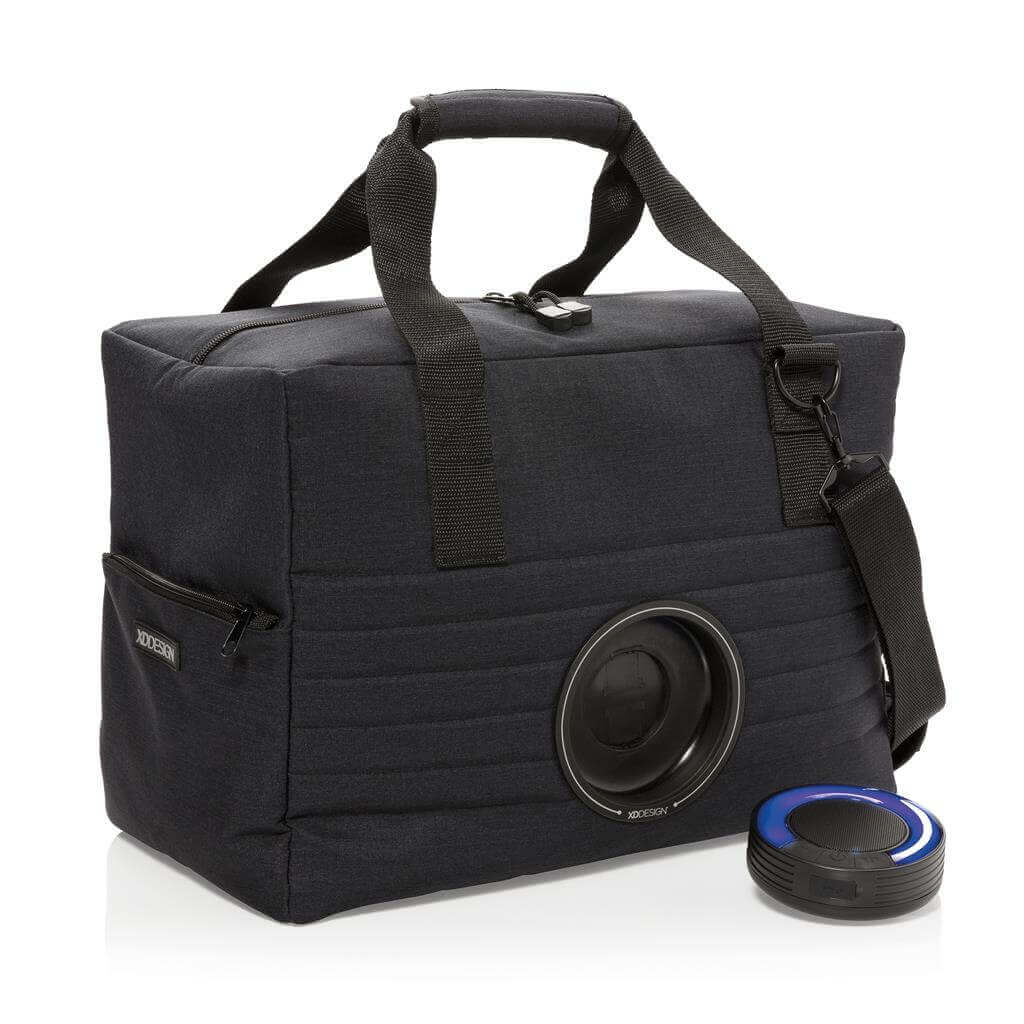 Veľká atraktívna taška na chladenie nápojov s odnímateľným vodotesným IPX5 bezdrôtovým reproduktorom s LED svetlom meniacim farby. Jednoduchých otočením vyberte reproduktor a používajte samostatne. Doba prehrávania: 5 hodín. Taška vhodná až na 32 plechoviek. Obsahuje popruh na rameno. Ochranný vzor® 1 batéria typu Li-poly súčasťou balenia.