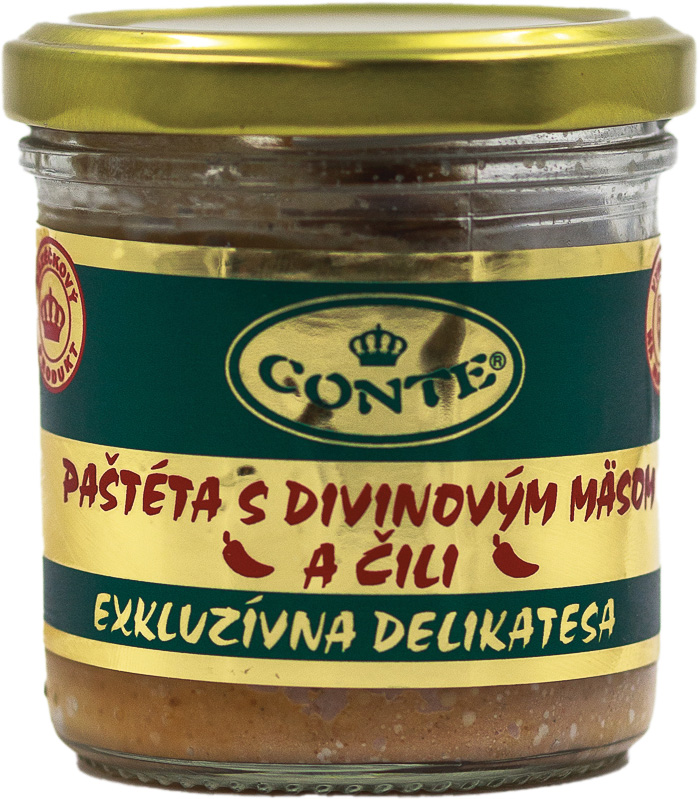 Paštéta s divinovým mäsom a čili – pikantná sterilizovaná paštéta zo 35 % bravčovej pečene, 30 % slaniny a 20 % divinového mäsa, dochutená čili, vývarom, soľou a prírodnými koreninami. Bez éčok.