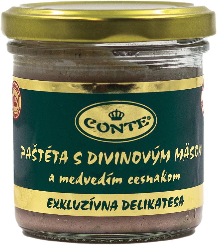 Paštéta s divinovým mäsom a medvedím cesnakom – lahodná paštéta zo 35 % bravčovej pečene, 30 % slaniny a 20 % divinového mäsa, obohatená o medvedí cesnak, vývar, soľ a koreniny. Bez éčok.