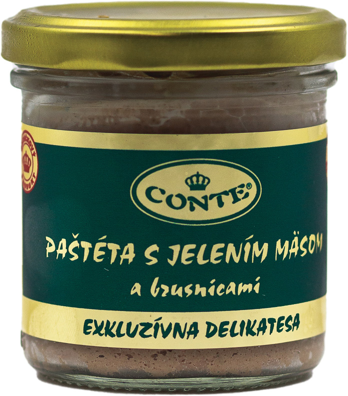 Paštéta s jelením mäsom a brusnicami – jemná paštéta zo 30 % pečene, 30 % slaniny a 20 % jelenieho mäsa, doplnená o brusnice, kukuričný škrob, prírodné koreniny, vodu a soľ. Sterilizovaná, bez éčok.