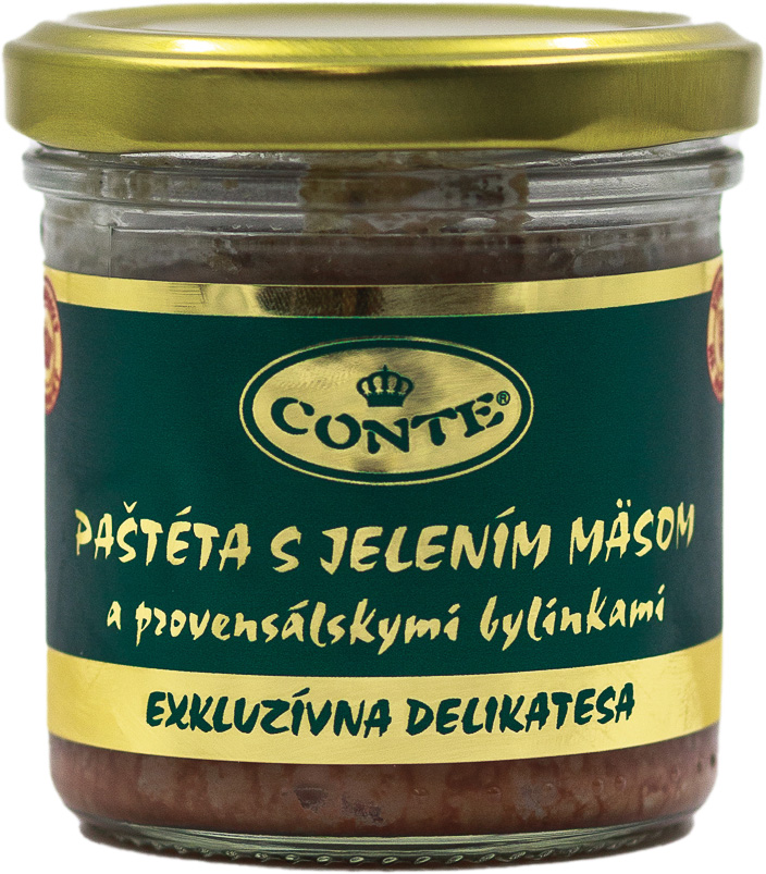 Paštéta s jelením mäsom a provensálskymi bylinkami 110 g – lahodná paštéta zo 30 % pečene, 30 % slaniny a 20 % jelenieho mäsa, ochutená provensálskymi bylinkami, kukuričným škrobom, soľou a koreninami. Bez éčok, sterilizovaná.