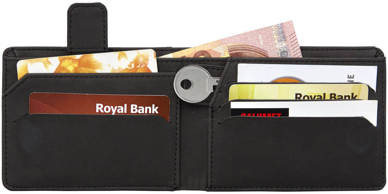 Peňaženka RFID Adventurer. Ochranná peňaženka RFID s tajnými priehradkami, ako je skryté púzdro na kľúče, skrytý zadný panel na extra hotovosť, vrecko na karty s ľahkým prístupom, štyri vrecká na karty, predné priehradka a priehradka na bankovky. Dodávanév darčekovej krabici Marksman. PU a polyester.