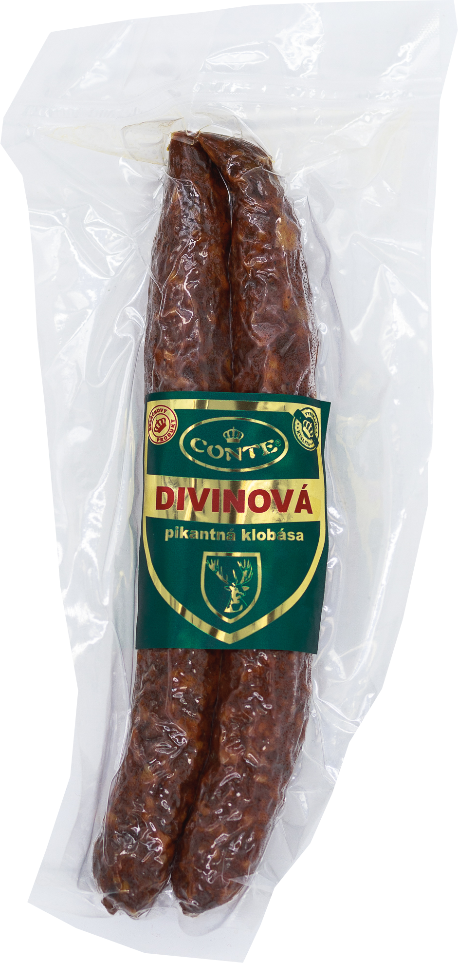 Pikantná divinová klobása – ostrá delikatesa z 51 % divinového, 26 % hovädzieho a 20 % bravčového mäsa, ochutená cesnakom, zázvorom a prírodnými koreninami, bez éčok, vákuovo balená. Skutočná chuť slovenských lúk so štipkou pikantnosti.