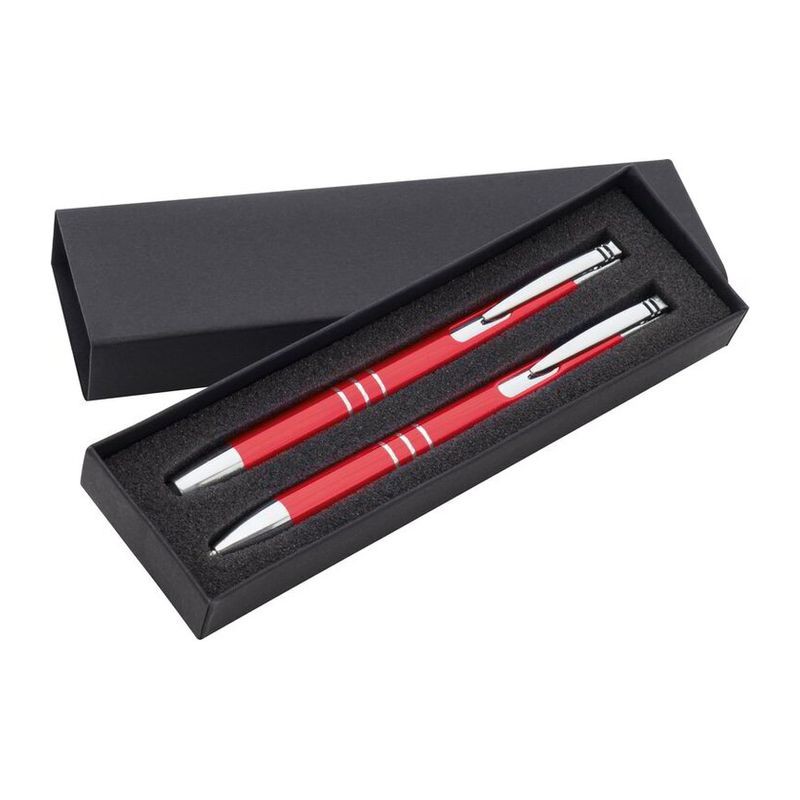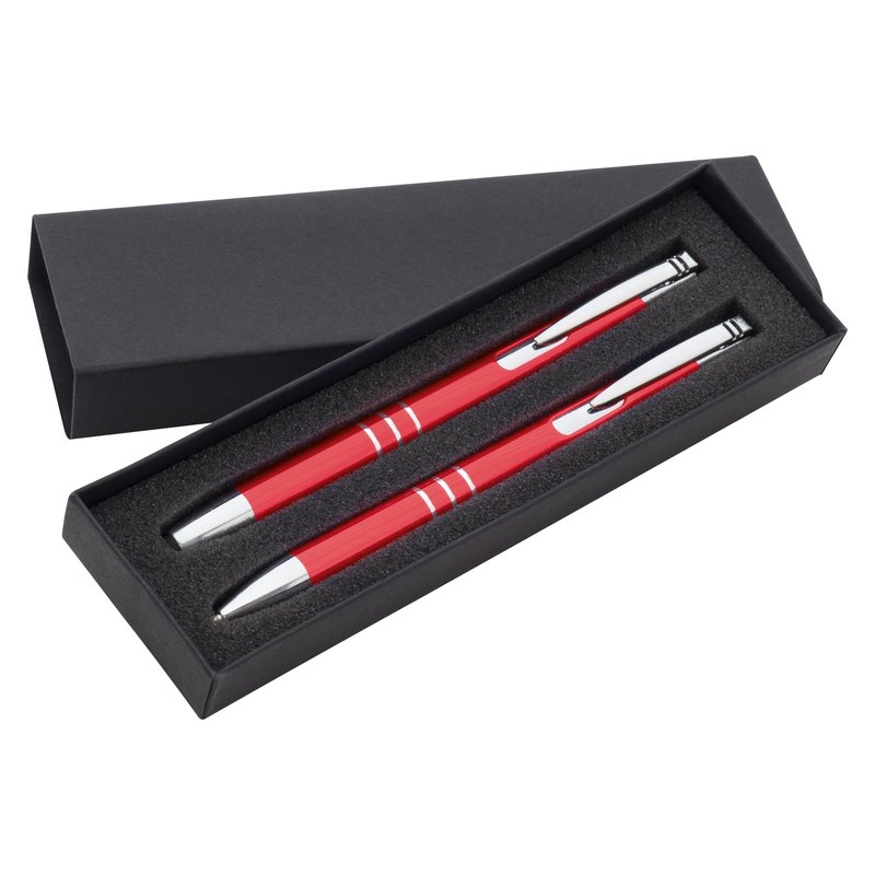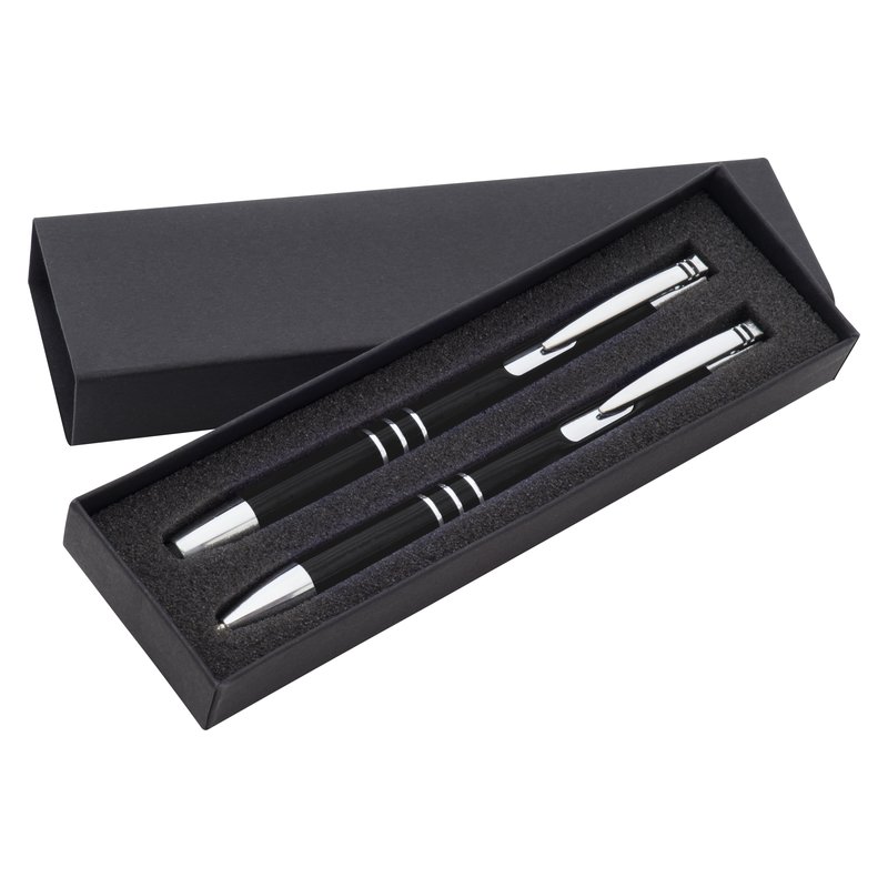 Kovová písacia sada, ktorá obsahuje jedno guľôčkové pero s dotykovou funkciou a jednu pentelku. Spôsob potlače gravírovanie.