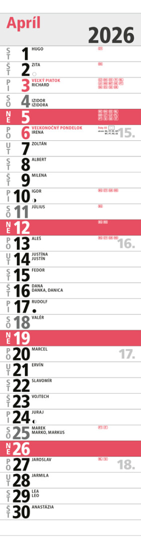 Moderný a prehľadný nástenný kalendár v červenom dizajne ponúka praktické mesačné kalendárium s menami SK, sviatky SK+ EU, fázy mesiaca. Ideálny pomocník pre každodenné plánovanie, pripomienky narodenín, menín či dôležitých udalostí počas celého roka.