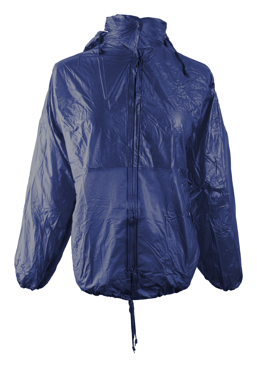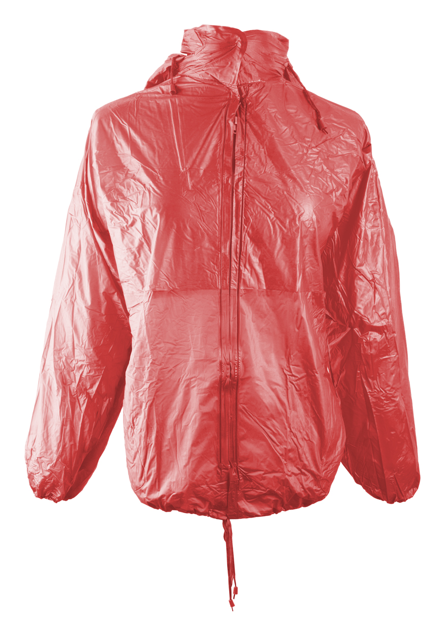 Pláštenka so zipsom po celej dĺžke, elastickými manžetami, s 2 prednými vreckami a so skrytou kapucňou. Možnosť zložiť do malej taštičky a pripnúť pásikom okolo pása. Materiál: PVC.