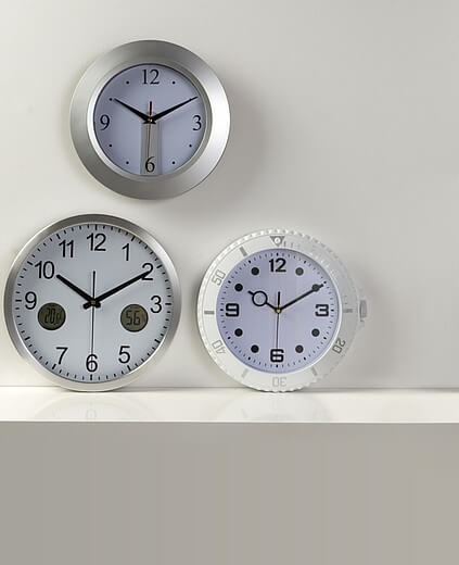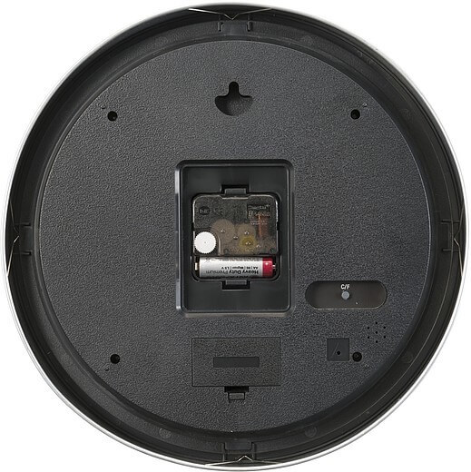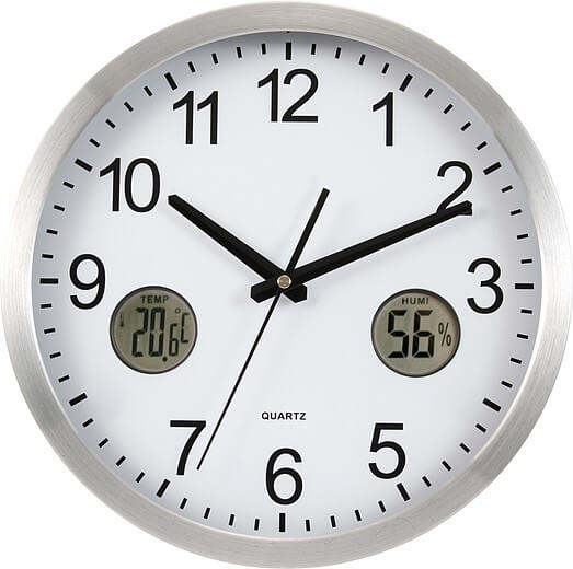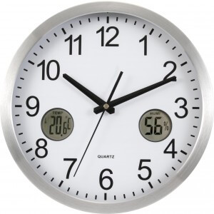 Plastové nástenné hodiny 30 cm s hladkým otáčaním z druhej ruky a dve digitálne funkcie na číselníku; vnútorný teplomer a vlhkomer. Vrátane batérií.