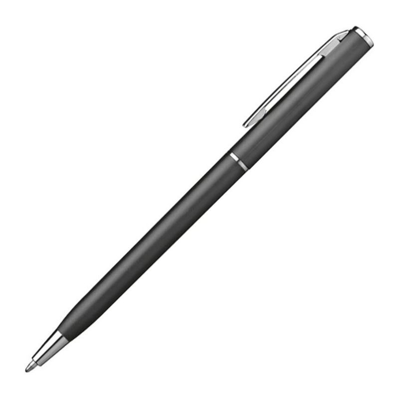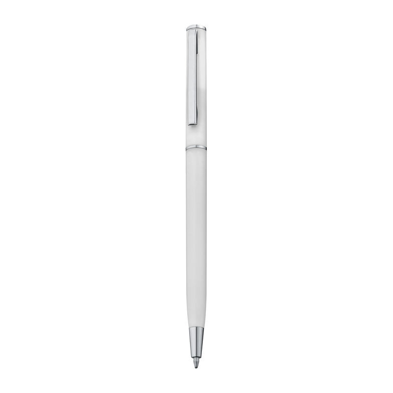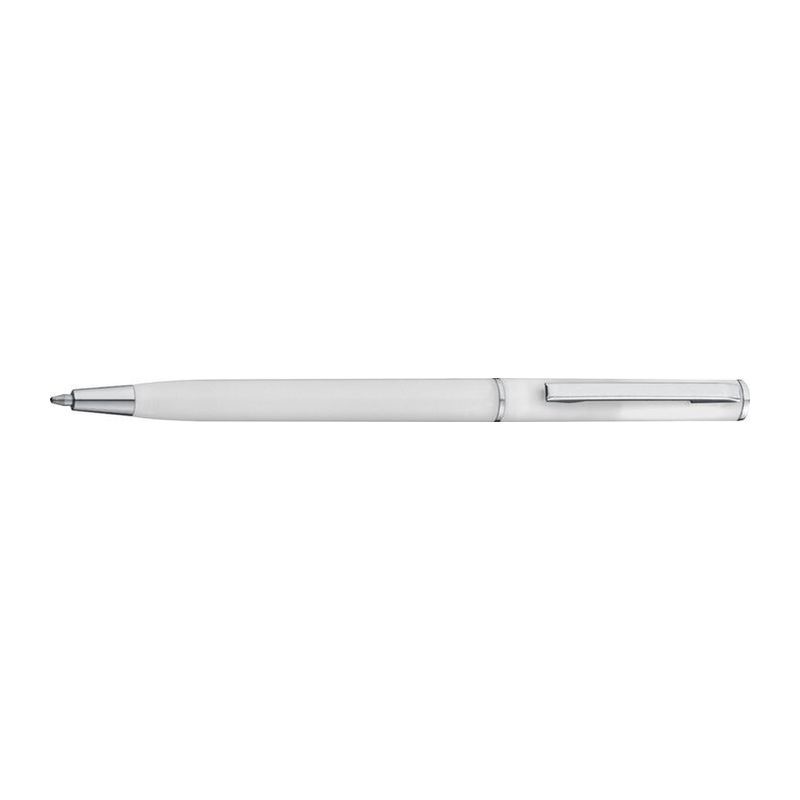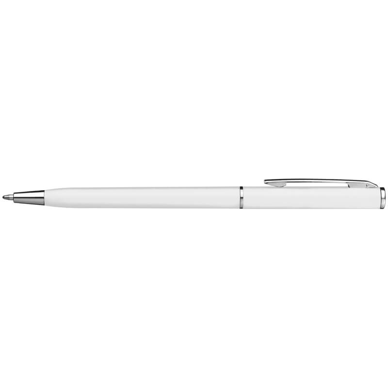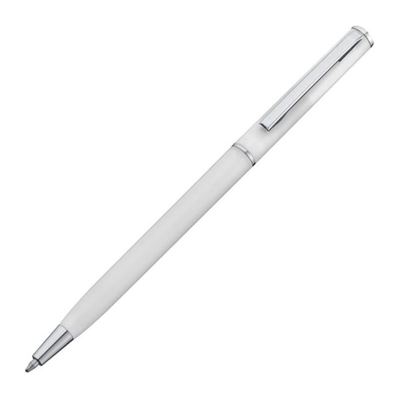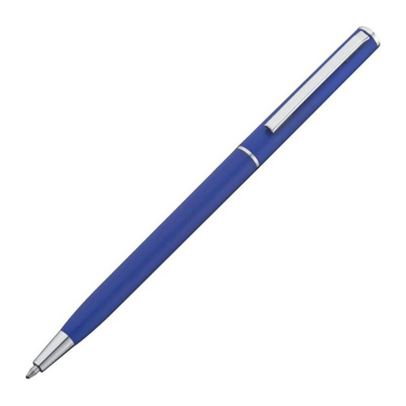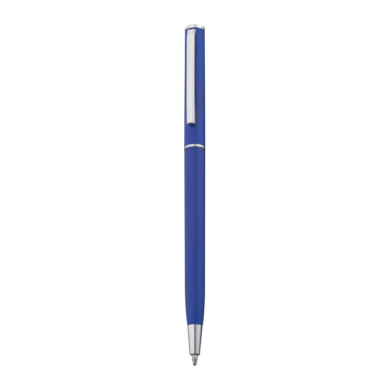 Guľôčkové pero z plastu s modrou náplňou. Toto guľôčkové pero vďaka svojmu štíhlemu tvaru dokonale hodí do slučiek poznámkových blokov. Vaše logo umiestníme pri klipe tampónovou potlačou.