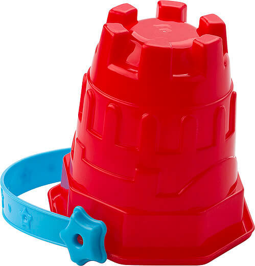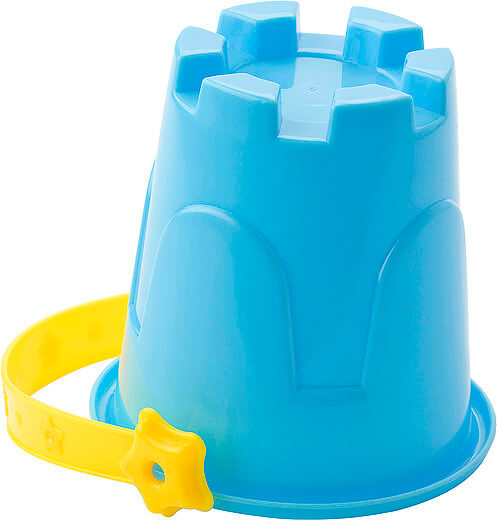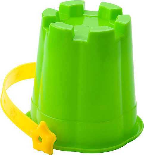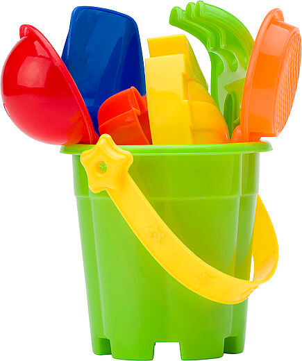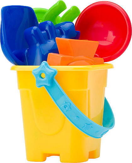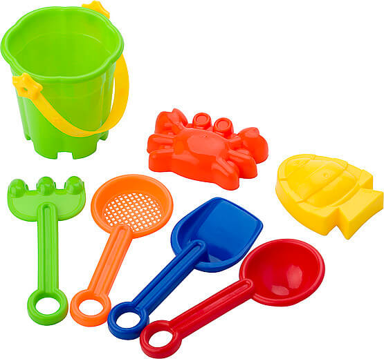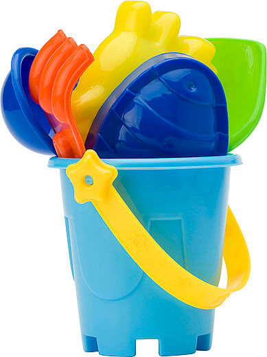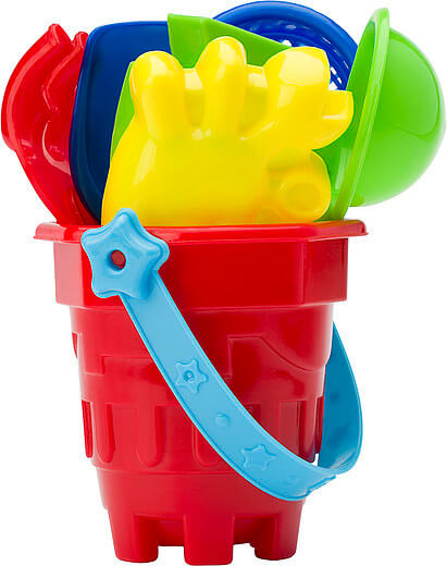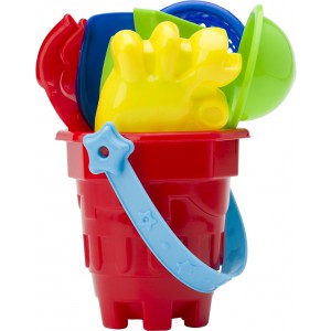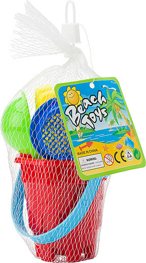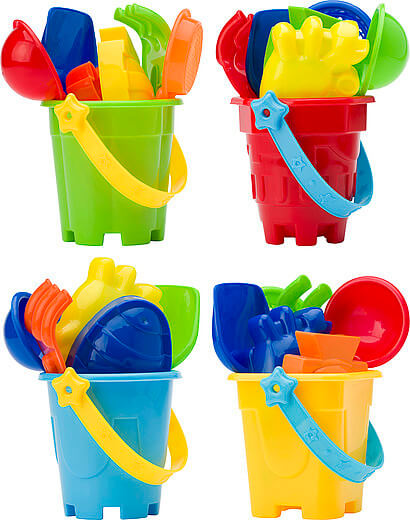 Plastové plážové vedro v štyroch rôznych štýloch / farbách. Každá vedra obsahuje mini náradie: lopata, hrable, lopatka, pieskové sitko a dve modelové časti. Jedna v tvare ryby a druhá v tvare kraba (predáva sa najrôznejšie).