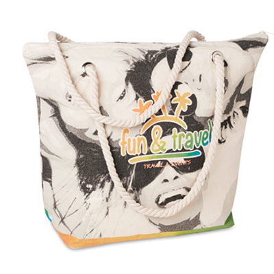 Plážová taška na mieru z plátna s povrazovou rúčkou. Bavlnená podšívka, vnútorné vrecko a zapínanie na zips. Rozmery: 48(š) x 38(v); dno 34(š)x17(h)cm. Rukoväte: 70 x 1,5 cm priemer. Upozorňujeme, že nie je možné kombinovať sieťotlač a digitálne vytlačené vzory. Materiál: 280 g/m² bavlna (plátno). Dodatočné zatváranie na zips / kovový gombík za príplatok.