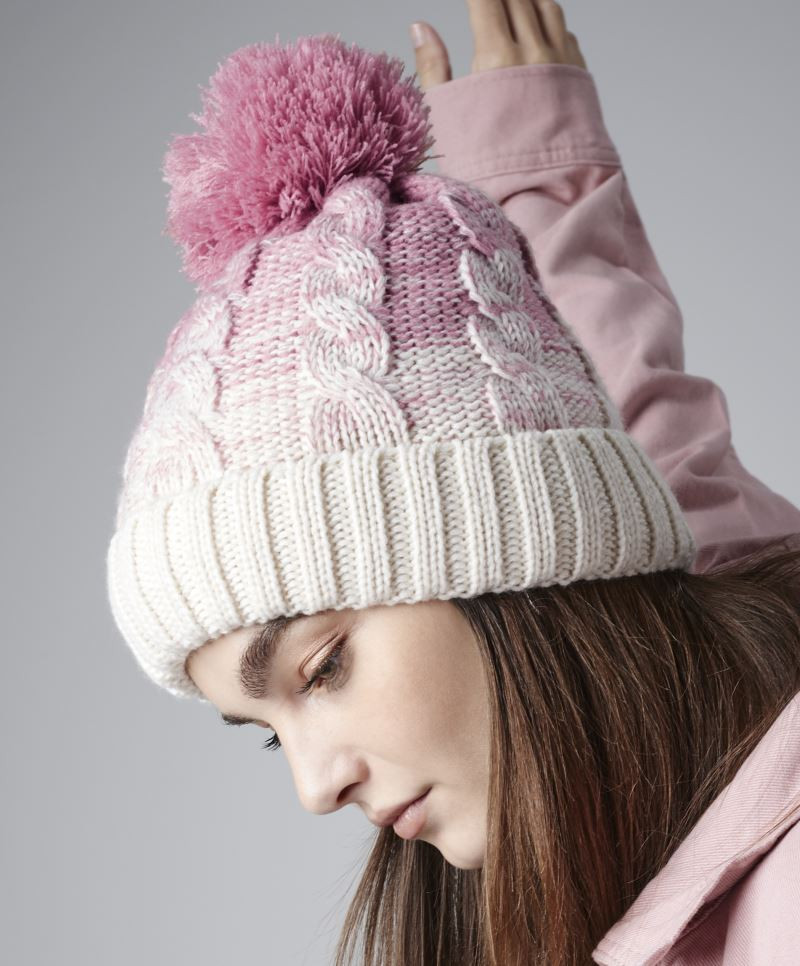 Jednofarebná brmbolca, vyhrnutý lem, farebný prechod, robustný úplet s vrkôčikovým vzorom z viacerých priadzí, mäkké na omak, štítok TearAway, ručné pranie, nemožno žehliť, nemožno sušiť v sušičke, nemožno chemicky čistiť.