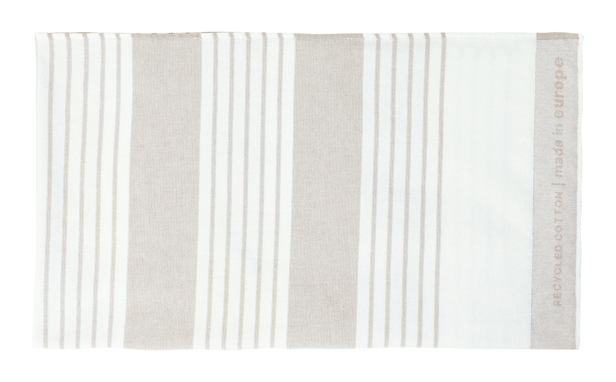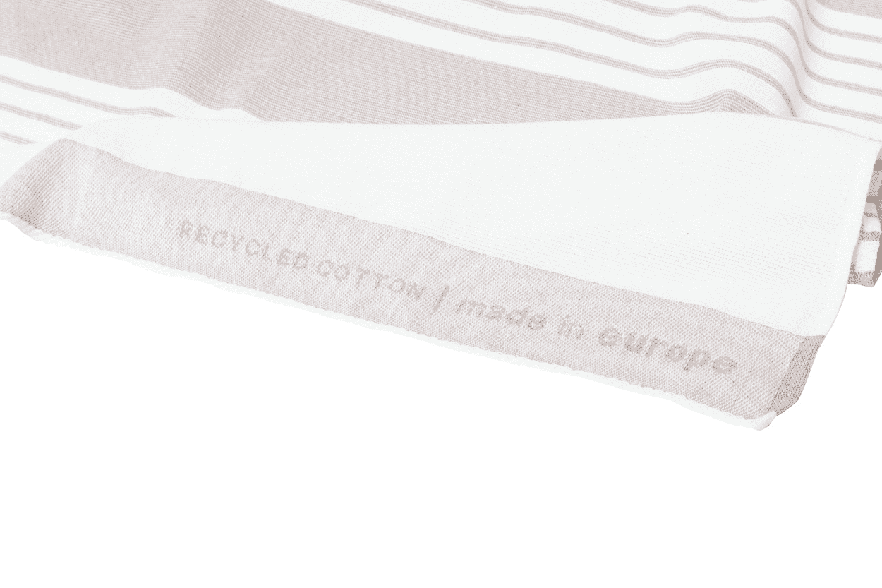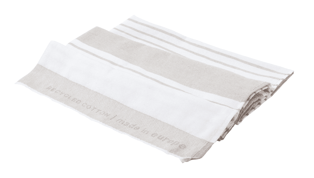 Dvojfarebná plážová froté osuška z polybavlny. Zmes 65% recyklovanej bavlny a 35% polyesteru, 330 g/m².
