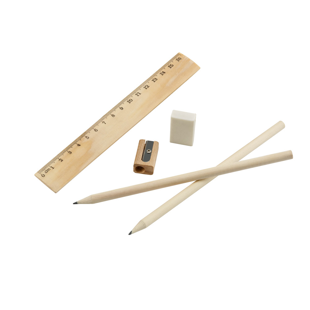 Sada na písanie, ktorá obsahuje 16.5 cm pravítko, 2 grafitové ceruzky (HB), 1 gumičku a 1 strúhadlo. Sada sa dodáva v puzdre z netkanej textílie (80 g/m²) so zapínaním so sťahovacou šnúrkou. 60 x 265 mm