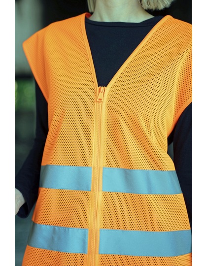 Bezpečnostná vesta zo sieťoviny v pohodlnom strihu. Dva univerzálne reflexné prúžky, každý široký 5 cm. Farebne zladený design. Zips vpredu. Signálna žltá certifikovaná podľa normy EN 17353, ostatné farby certifikované podľa normy EN ISO 20471.