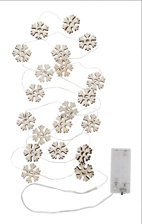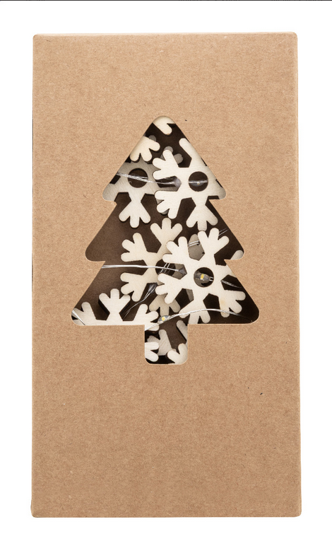 Vianočná svetelná dekorácia s 20 LED svetlami v tvare drevenej snehovej vločky. Funguje na 2 AA batérie, bez batérií. S tlačidlom ZAP/VYP na puzdre na batérie. V krabičke z kraftového papiera. Batéria je súčasťou balenia: Nie. Úroveň jasu: 120 lumen