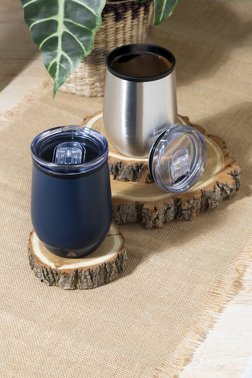 Dvojstenný termo hrnček z recyklovanej nerezovej ocele s vnútornou stranou z PP a viečkom z PS. 350 ml. New. Go Green. Vhodné do umývačky riadu: Nie. Vhodné do mirkovlnnej rúry: Nie. Typ steny: Dvojitá stena. Typ izolácie: Vzduchová izolácia. Doba izolácie za studena: 5 hodín. Doba izolácie za horúca: 3 hodiny. Odolné voči poliatiu / nepriepustné: Nepriepustné