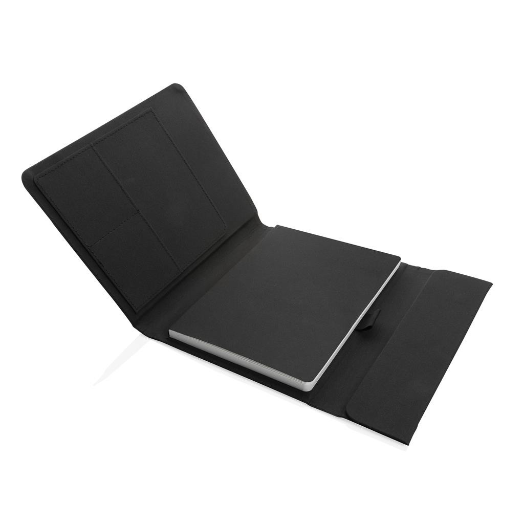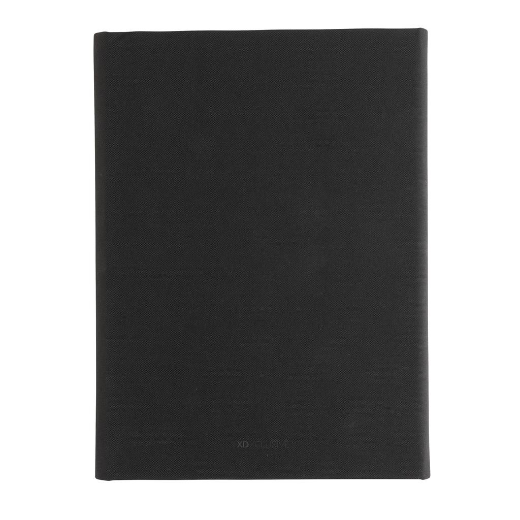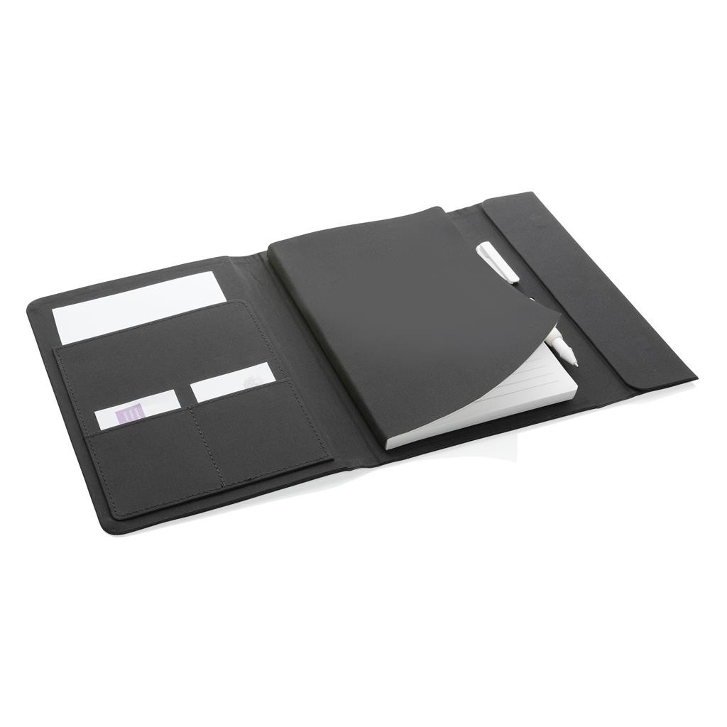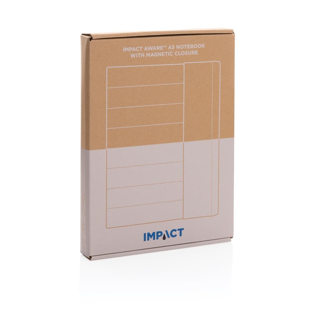 Moderné portfólio vo formáte A5 z kolekcie Impact. Vnútri obsahuje 1 veľké vrecko, 2 sloty na vizitky alebo karty, pútko na pero a ladiaci vymeniteľný poznámkový blok z recyklovaného linkovaného krémového papiera (64 listov/128 strán, 80g/m2). Vyrobené z recyklovaného polyesteru vrátane skenovateľnej zložky AWARE™ garantujúce obsah recyklátu. Na výrobu bolo využitých 6,5 500ml PET fliaš a bolo usporených 3,9 litrov vody. Z výťažku každého predaného produktu z kolekcie Impact je navyše prispených 2 % na podporu iniciatívy Water.org. Bez PVC.