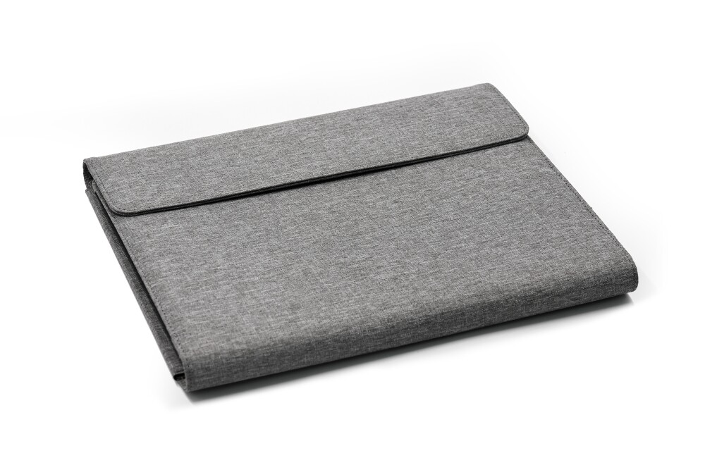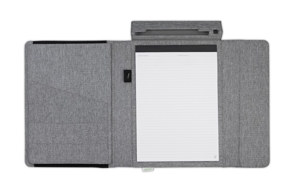 Portfólio, vytvorené z recyklovaných PET fliaš a papiera, je prémiovým obchodným fóliom, ktoré je ideálne pre zaneprázdnených, organizovaných profesionálov. Obsahuje priestor pre poznámkový blok A4, vrecko na tablet/notebook (do 13") a priehradky na nevyhnutnosti, ako sú vizitky. Má magnetický zatváranie, pevnú väzbu a skladací organizér na stôl. Rozmery: 26,5 x 32 x 2,5 cm