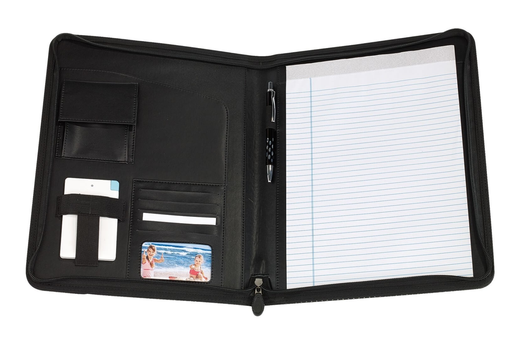 Portfólio "Hill Dale", veľkosť A4: rôzne slip-in vnútorné vrecká, jedno malé vrecko so zapínaním s tlačidlom, gumičkou pre Power Bank a pod.,, pútko pre písací nástroj, kovová plôška na vaše logo